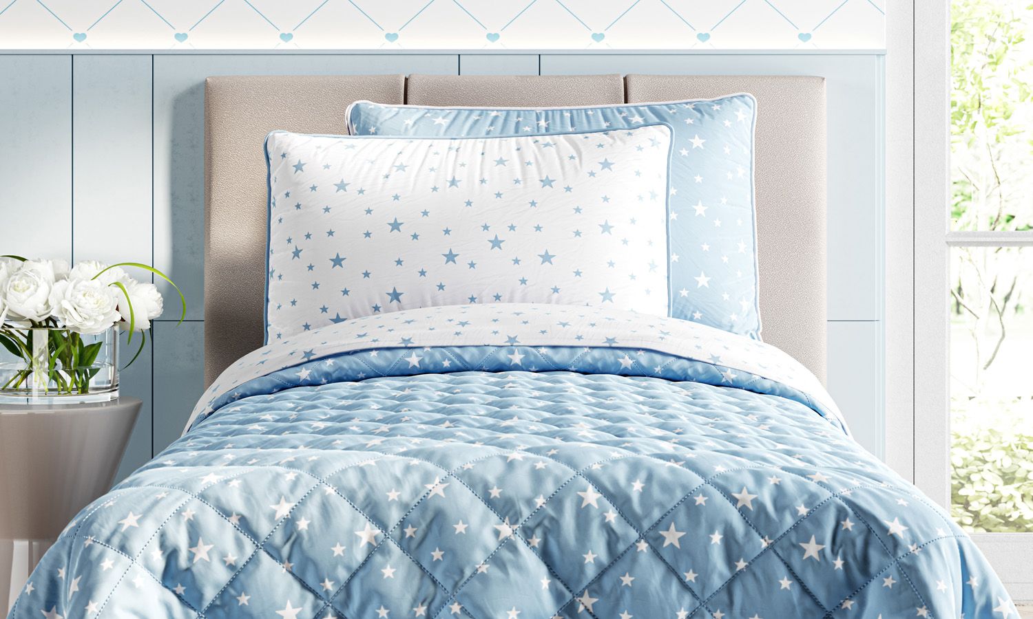 São peças exclusivas em azul e branco com uma divertida estampa de estrelas, que combina facilmente com diversos estilos de decoração. Um enxoval para cama de solteiro digno de capa de revista para encantar crianças e adultos!