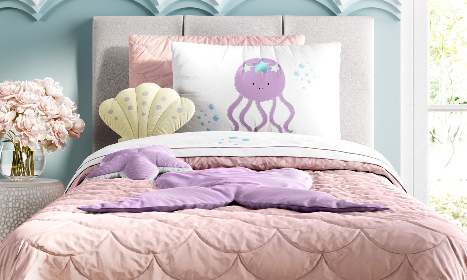 Um mar cor-de-rosa para a sua pequena sereia! O Kit Cama Infantil Solteiro Menina Sereia encanta pela atmosfera lúdica e delicadeza de detalhes em peças exclusivas que são puro conforto, graças à suavidade do tecido 100% algodão.