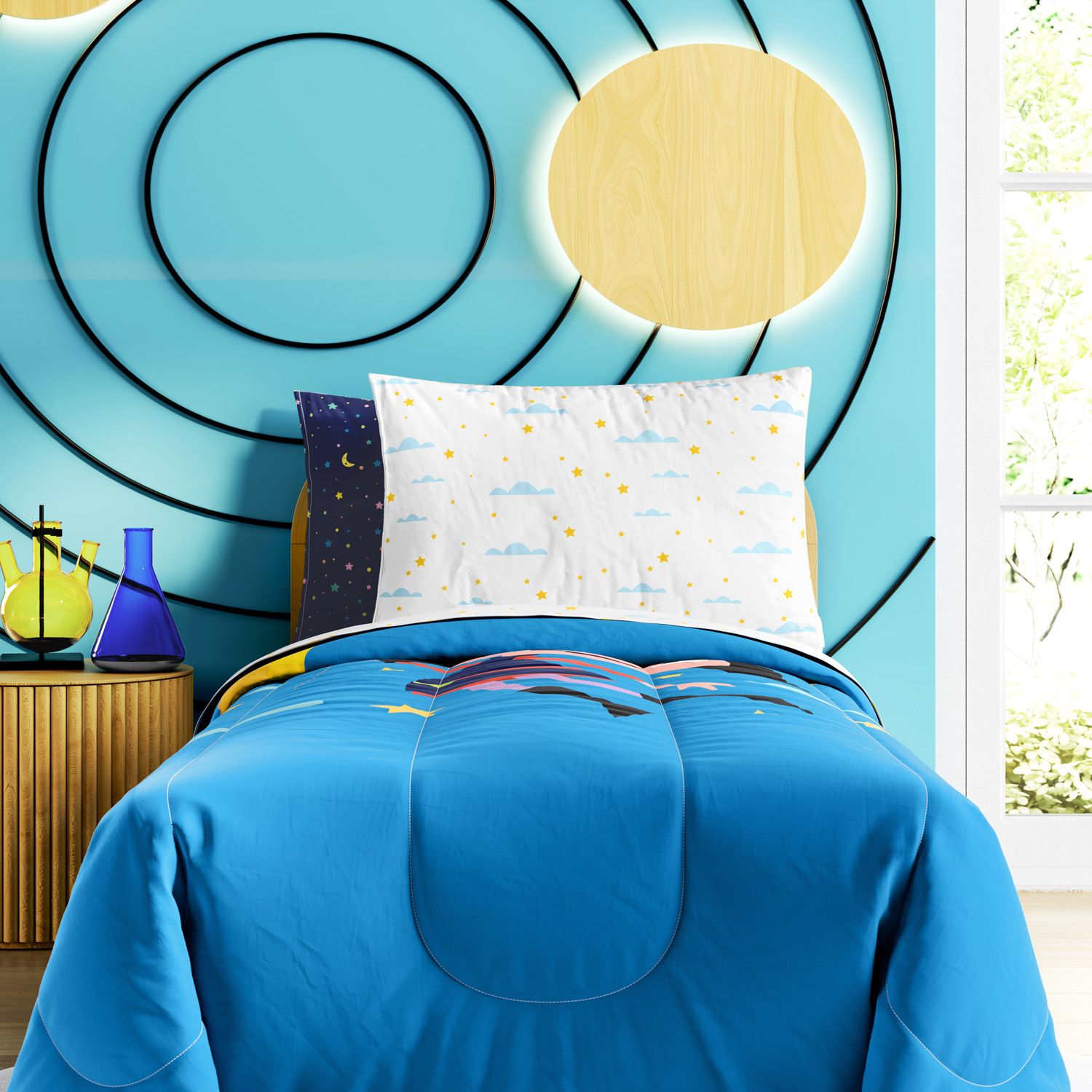 O enxoval para cama de solteiro traz estampas inspiradas nos personagens Luna, seu irmão Júpiter e o furão de estimação da dupla, Cláudio. Uma turminha que embarca em aventuras pelo saber e que instiga a imaginação e criatividade das crianças!