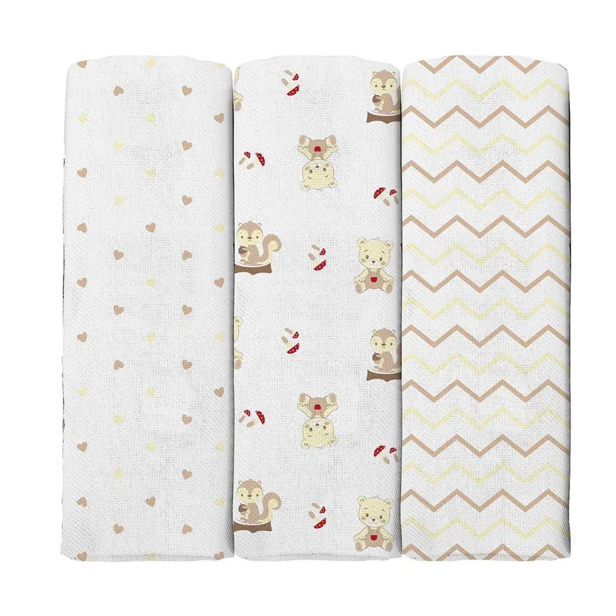 O Kit Cueiro da linha Bublim da Incomfral possui 03 peças confeccionadas em tecido flanelado 100% algodão super macio e estampado. Embalado em rolinhos.