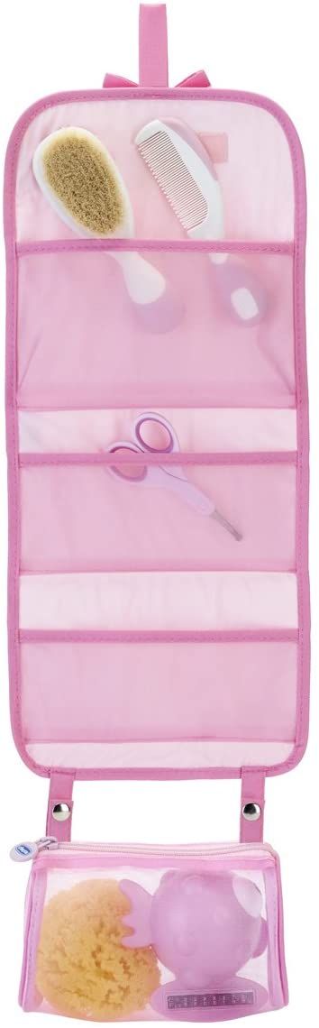 O Kit Higiene Menina Chicco é uma ótima opção para passeios e para utilizar em casa.Seus bolsos permitem que a mamãe carregue tudo que precisa para a hora do banho. A bolsa é feita em tecido próprio para objetos molhados.