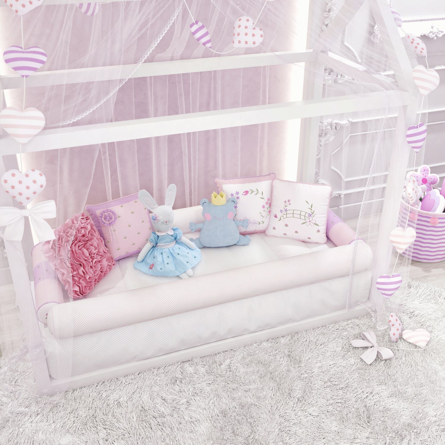 O Kit acompanha edredommontessori com estampa de bolinhas delicadas e suaves nas cores lilás, rosa e verde, além de um confortável enchimento, os rolinhos frontal, traseiro, cabeceira e peseira que esbanjam charme e conforto, com as plantinhas Vitória-Régia bordadas e o viés com tubinho na lateral que se destacam na caminha montessori e com o útil lençol com elástico. Um kit que impressiona a todos!