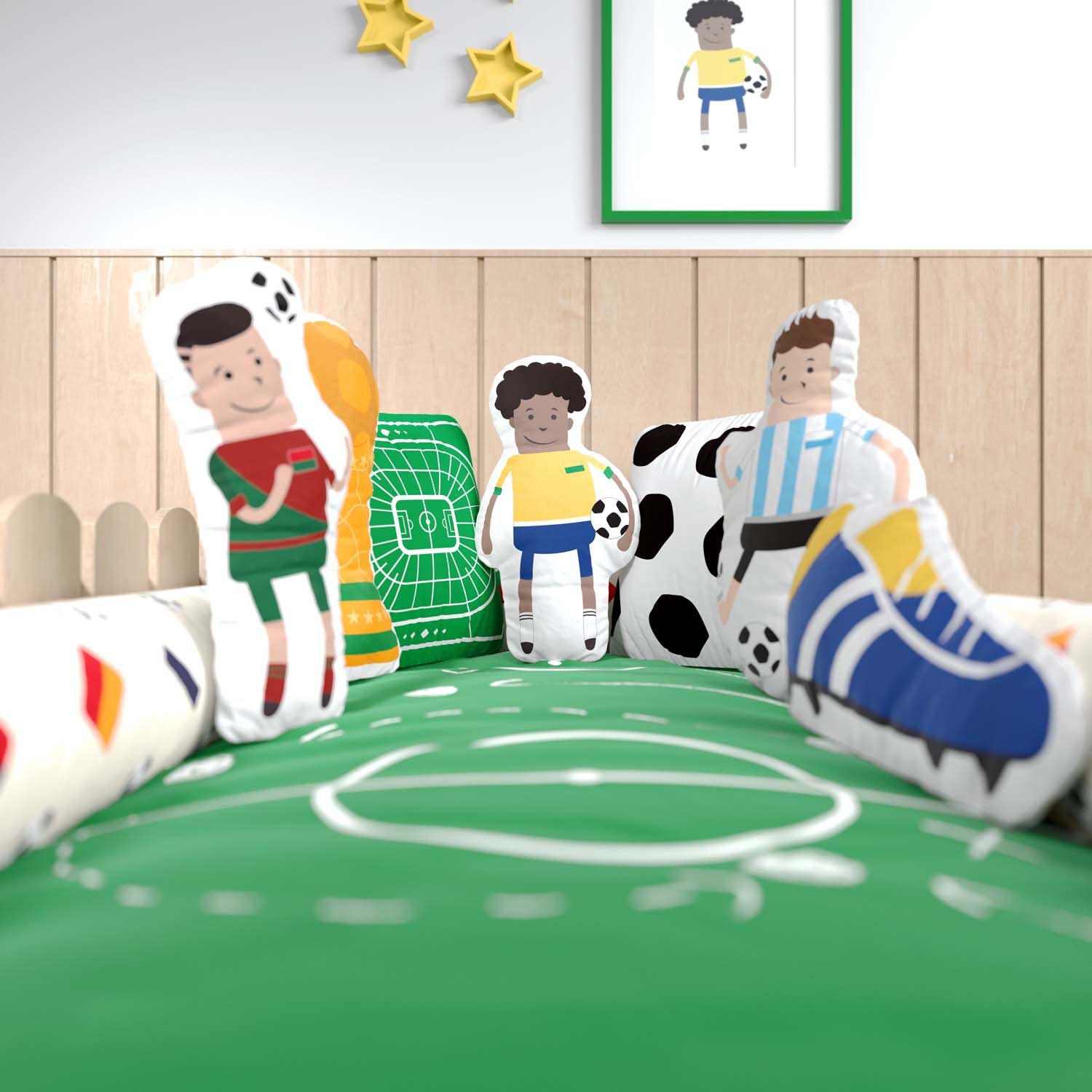 Confeccionado em tecido de toque suave, o conjunto capricha na criatividade e instiga a imaginação dos pequenos jogadores. Na paleta de cores, o verde simboliza o campo de futebol e o bege adiciona suavidade ao enxoval.