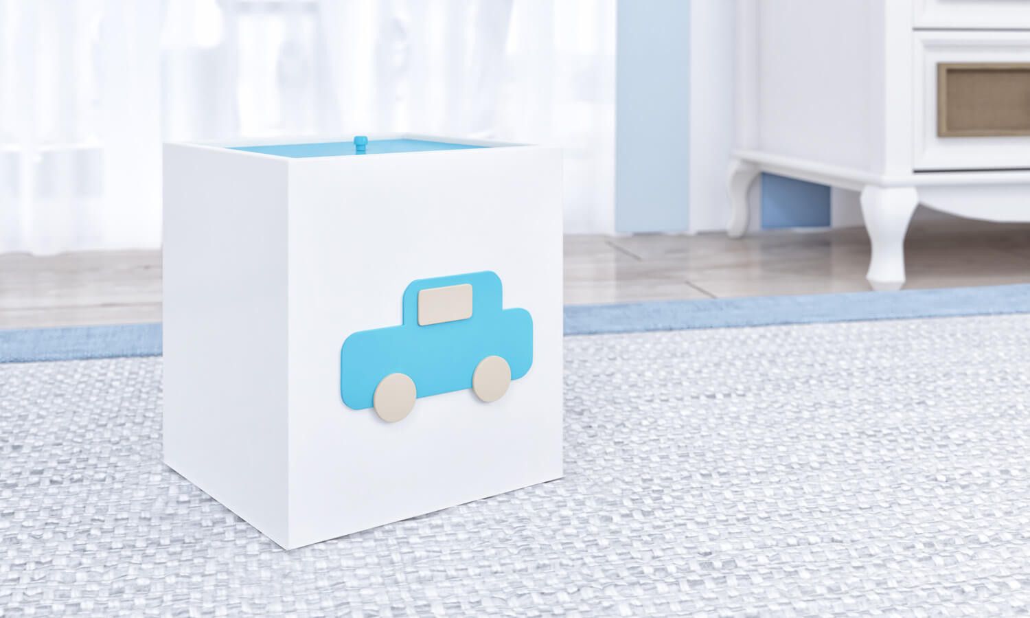 A Lixeira Carrinhos vai auxiliar na rotina de cuidados e organização do quarto de bebê! Feita de madeira MDF, a peça é prática e ideal para descartar pequenas embalagens, como algodão, cotonetes e até as fraldinhas do neném. Esse modelo exclusivo ganhou uma tampa azul e um detalhe moderno: o lúdico carrinho de madeira com rodinhas.