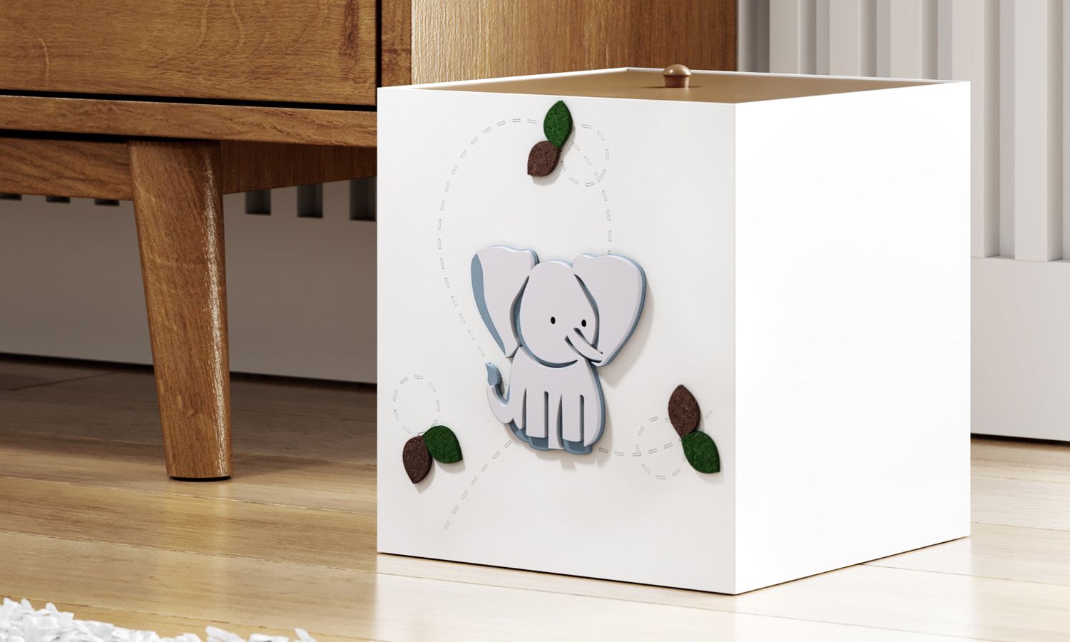 Produzida em madeira 100% MDF, a Lixeira Elefantinho Safári Baby traz apliques coloridos e folhas de feltro para completar o visual do quarto de bebê e facilitar sua rotina de cuidados com o seu amor.