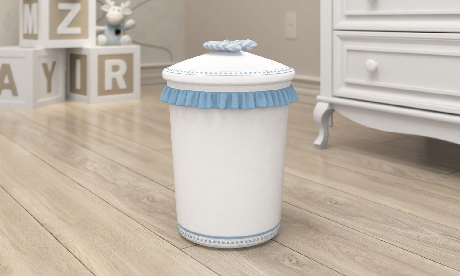 Essa linda Lixeira com tampa da Coleção Nino e a Pipa é uma ótima escolha para compor a decoração do quarto de bebê e facilitar a rotina das mamães e papais. Ideal para descartar pequenas embalagens e objetos, entre eles, algodão, cotonetes e as fraldas do bebê. O modelo de plástico é decorado com babados e um lacinho na tampa. Confira também o Kit Higiene completo!