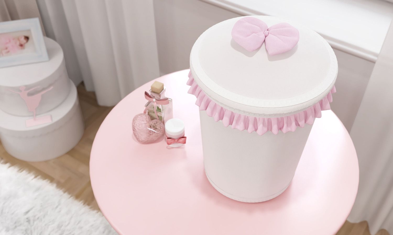 A Lixeira do enxoval Pequena Bailarina combina com diversos temas femininos para decoração do quarto de bebê, pois seus babados cor de rosa e o lacinho floral são bem suaves. Esse modelo plástico com tampa é a escolha mais indicada para o quartinho, para descartar pequenos objetos, algodão, cotonetes e até a fraldinha na hora da troca.