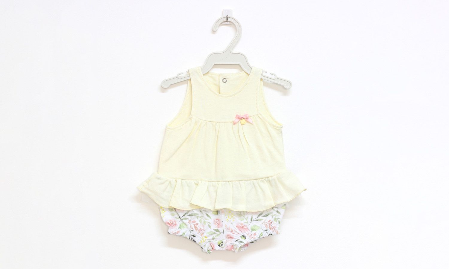 Uma roupinha fresca e charmosa para a sua menina aproveitar os dias de sol! O Macacão Bata Floral Amarelo traz uma estampa delicada e aplique de lacinho, além do babadinho na cintura. Confeccionada em tecido 100% algodão, a peça vem com botões entre as pernas para facilitar na hora de vestir e nas trocas de fraldas!