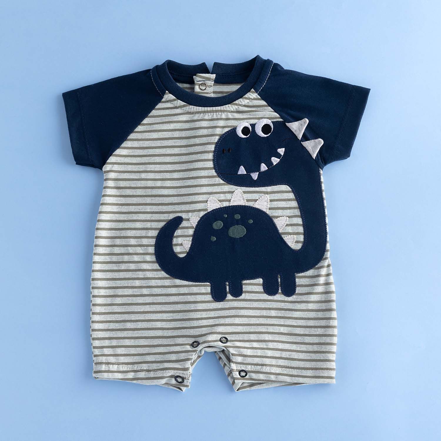 O macacãozinho também possui fechamento com botões de pressão na parte inferior, mangas curtas fresquinhas, bordado de dinossauro divertido e encantador e um aplique de cauda para estimular sensorialmente o seu príncipe.