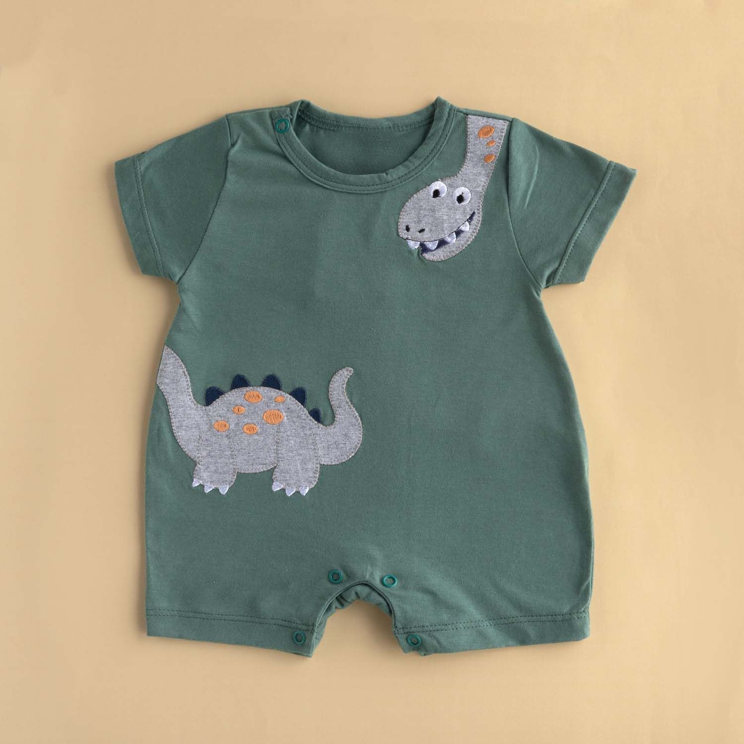 O macacãozinho também possui fechamento com botões de pressão na parte inferior, mangas curtas fresquinhas e um bordado de dinossauro divertido e encantador.