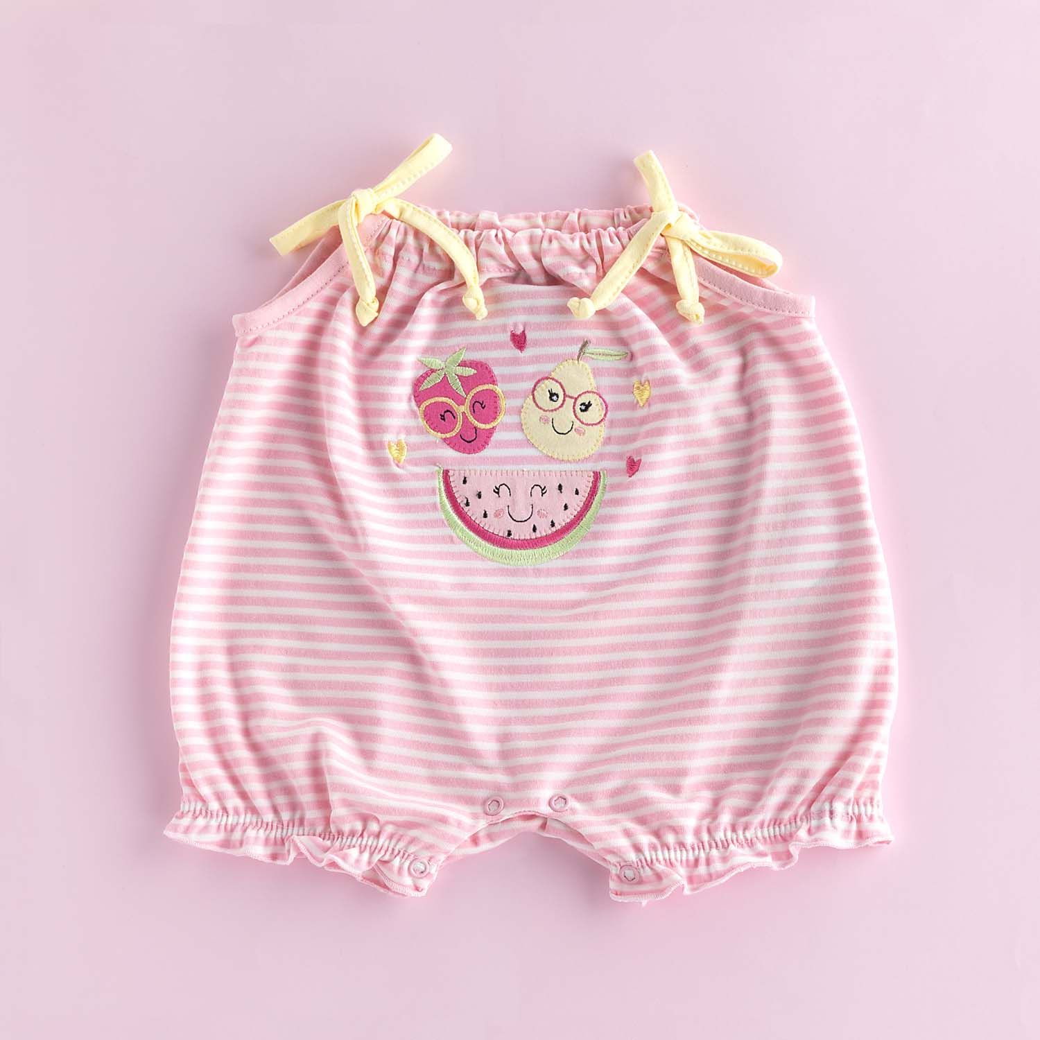 O macacãozinho também possui fechamento com botões de pressão na parte inferior, alças reguláveis com lindos lacinhos e um bordado divertido e colorido de frutinhas.