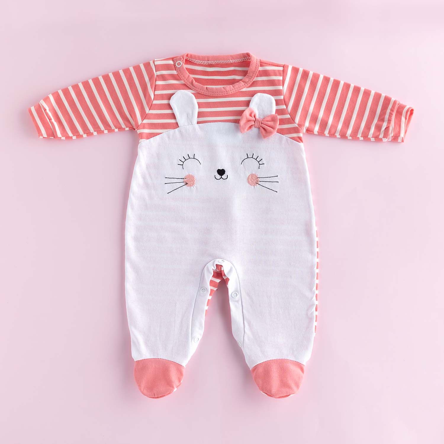 O macacãozinho também possui fechamento com botões de pressão nas partes superior e inferior, um bordado divertido e colorido de coelhinha e um aplique de orelhas interativas para estimular sensorialmente a sua pequena.