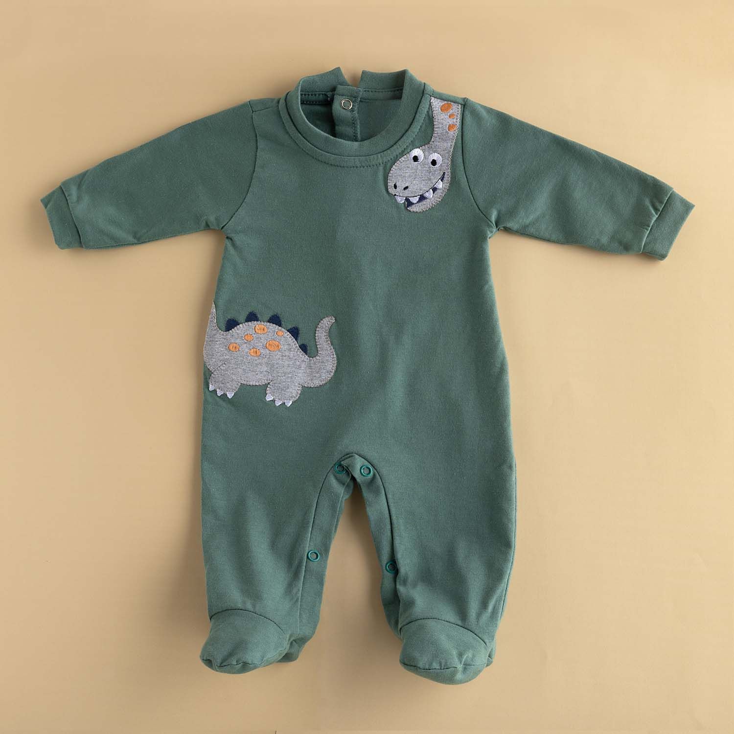 O macacãozinho também possui fechamento com botões de pressão na parte inferior, mangas longas quentinhas e um bordado de dinossauro divertido e encantador.