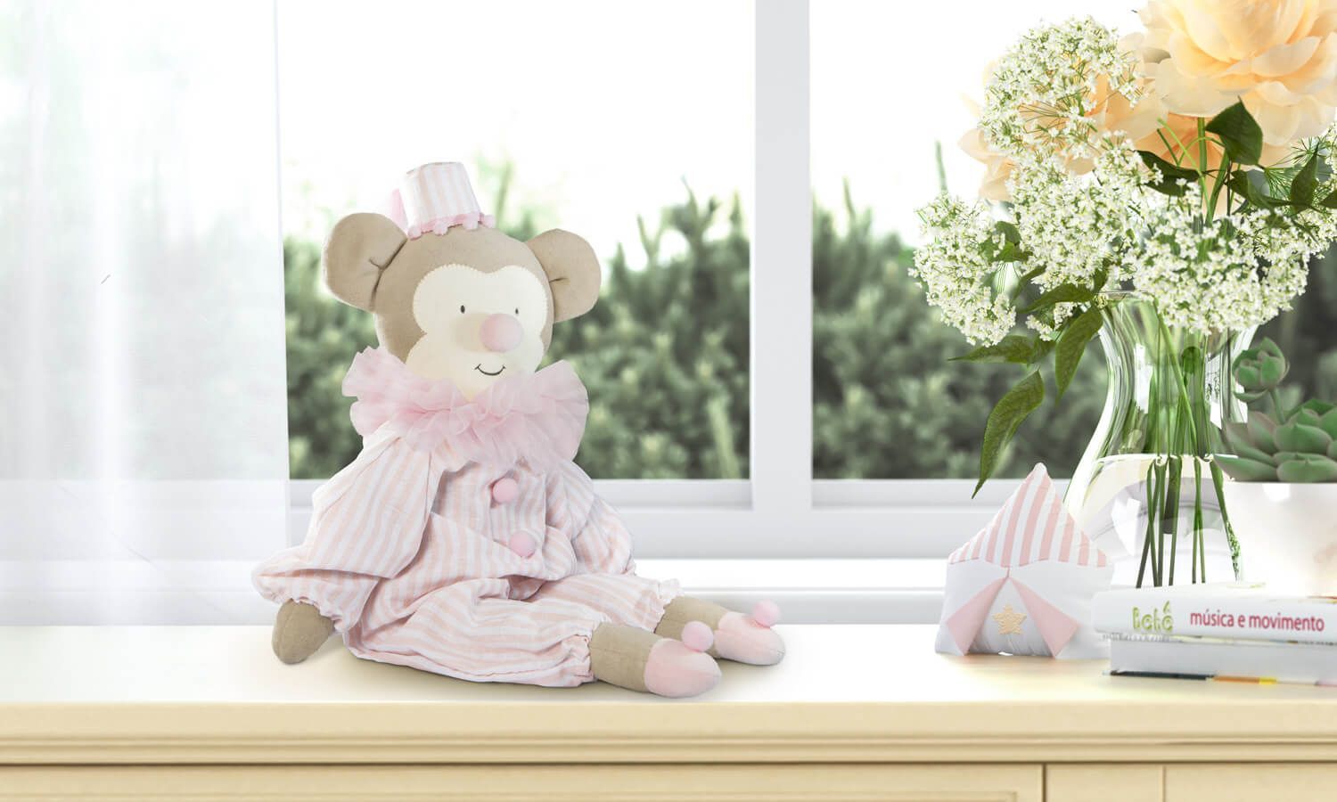 Diversão garantida! Além de compor um ambiente lúdico com criatividade e aconchego, o BMacaquinho Mimo Palhaço do Circo 48cm aparece para completar a decoração do quarto de bebê com uma proposta super meiga! Esse simpático macaquinho veste uma roupinha completa, com delicados pompons e nariz de palhaço. Com um duo rosa e branco, usa um gracioso chapéu com listrinhas e a gola de tule chama a atenção desse mimo confeccionado com a maciez do tecido plush e enchimento macio. O rostinho bordado à mão finaliza com elegância essa peça repleta de detalhes. Ótima companhia para brincar e tornar o décor mais afetivo, além de proporcionar momentos especiais para o seu amor.