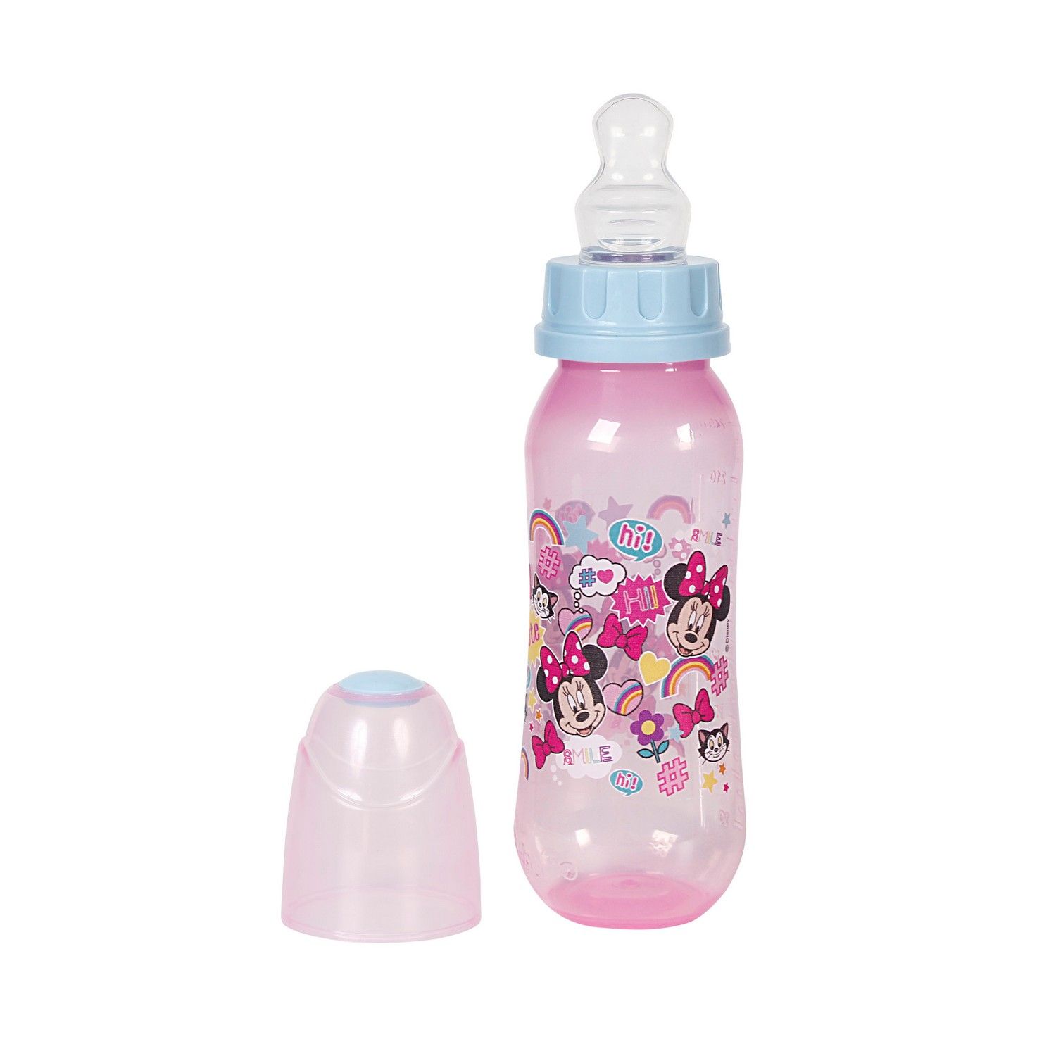 Com formato anatômico, a mamadeira possui bico achatado e simétrico, que possibilita o posicionamento correto na boca do bebê.