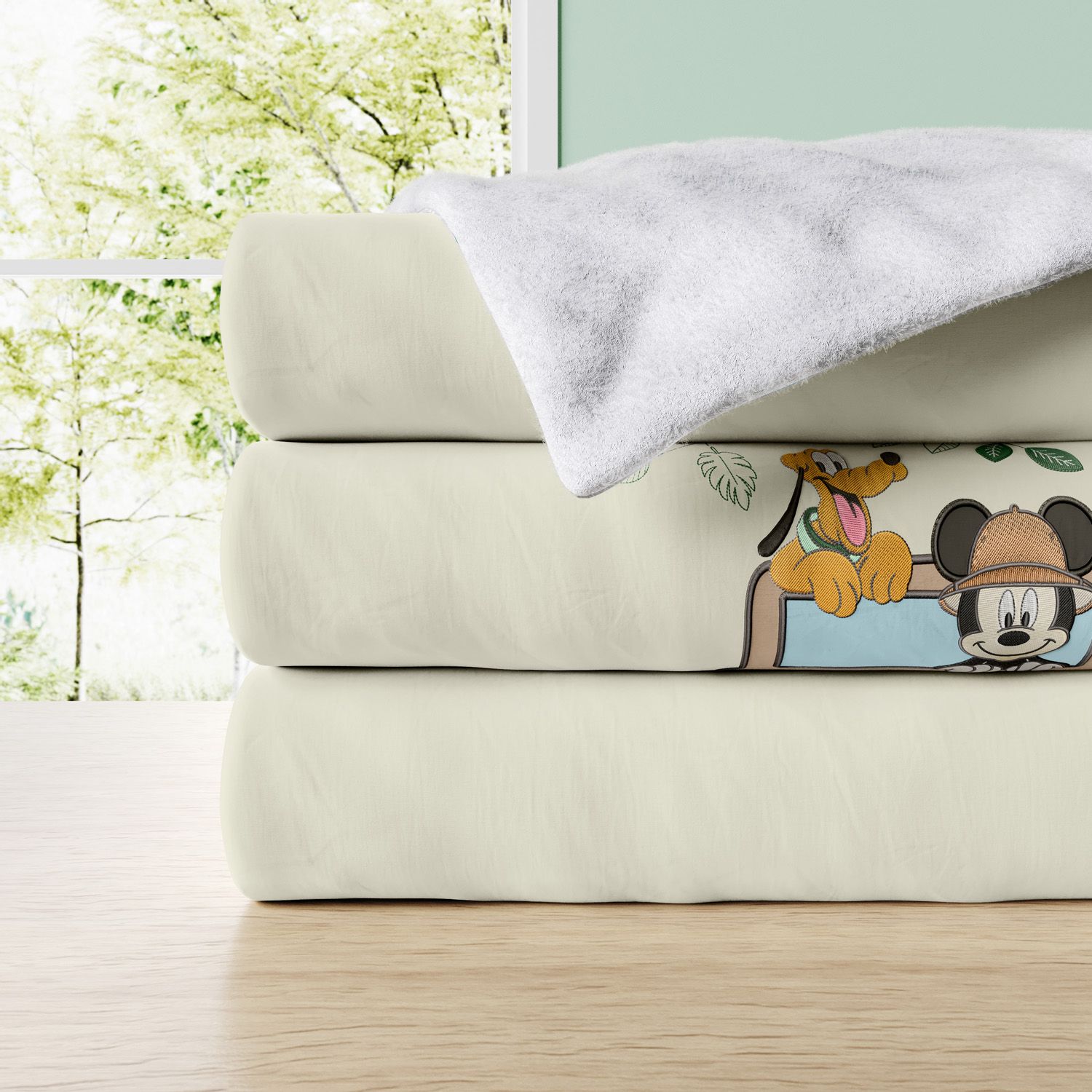 A Manta Infantil Pluto e Mickey Mouse Safári é uma criação exclusiva Grão de Gente para completar a decoração do quarto infantil com um toque lúdico e divertido.