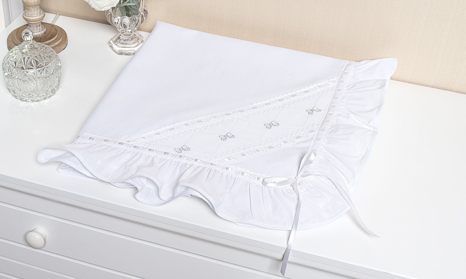 A Manta Laço Branco traz elegância e suavidade ao enxoval de bebê! Confeccionada com a maciez do algodão, a peça bordada com babadinhos, passa fita de cetim e viés atualiza a definição de delicadeza! Perfeita em todas as estações, essa mantinha pode ser utilizada em passeios, festas, no carrinho e para as melhores sonecas. Opção ideal para presentear com graça e beleza.