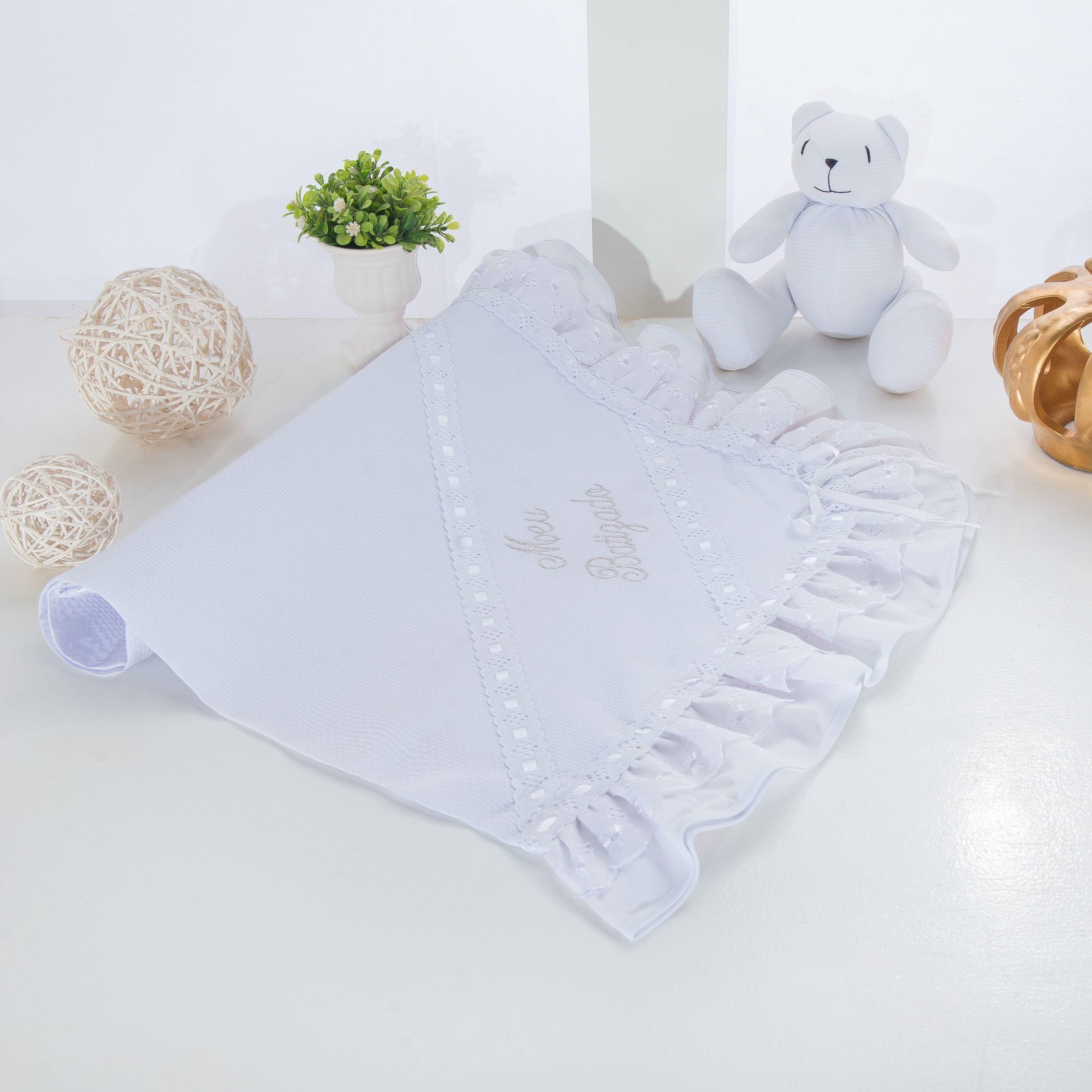 A Manta Meu Batizado Branca traz elegância e suavidade para o momento mais especial! Confeccionada com a maciez do tecido 100% algodão em piquet, a peça com babadinhos, bordado inglês e passa fita de cetim atualiza a definição de delicadeza. Uma recordação clássica e inesquecível!