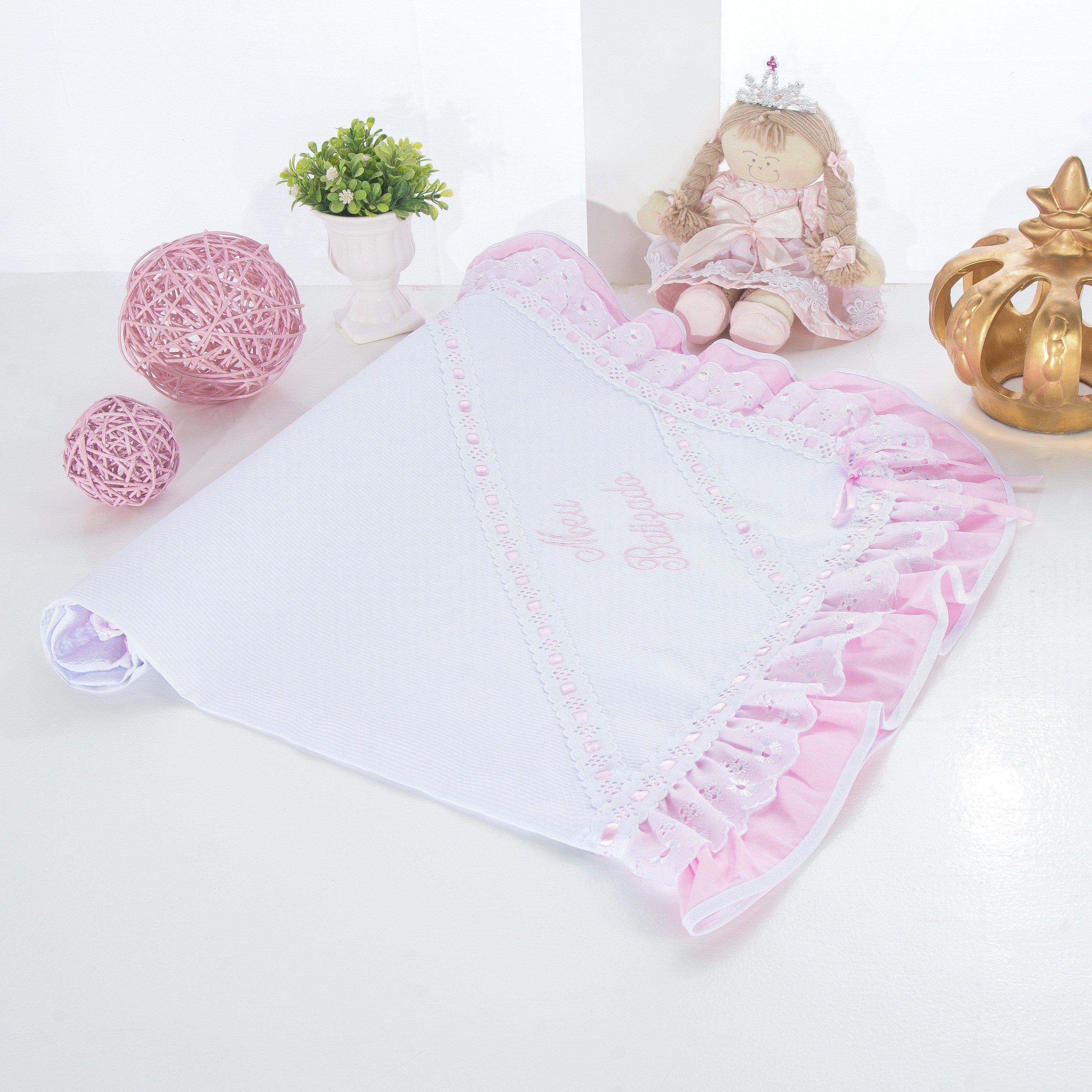 A Manta Meu Batizado Rosa traz elegância e suavidade para o momento mais especial! Confeccionada com a maciez do tecido 100% algodão em piquet, a peça com babadinhos, bordado inglês e passa fita de cetim atualiza a definição de delicadeza. Uma recordação clássica e inesquecível!