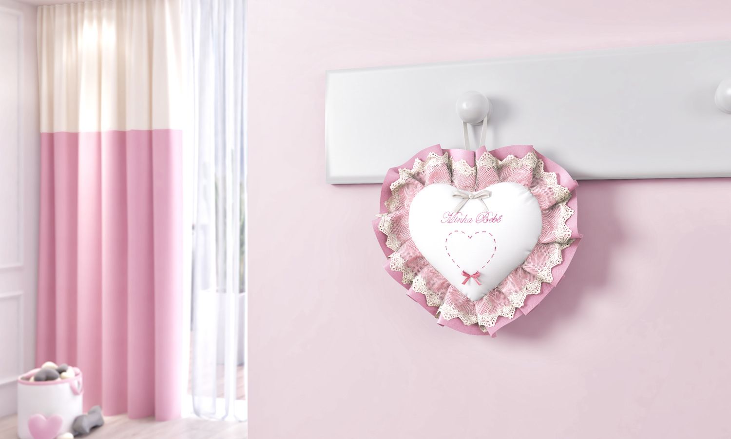 O Medalhão de Porta Coração é apaixonante e vai sofisticar a entrada do quarto de bebê mais perfeito! A peça enfeita a porta da maternidade, completa a decoração do ambiente e convida a família e os amigos para entrar no cantinho da princesa — o lugar mais especial da casa! Romântico, esse modelo exclusivo conta com os mais belos belos detalhes de babado rosa e renda guipir, que abraçam um delicioso tecido acolchoado, além do bordado exclusivo de coração pontilhado e as palavras “Minha Bebê”. Linda opção de presente!