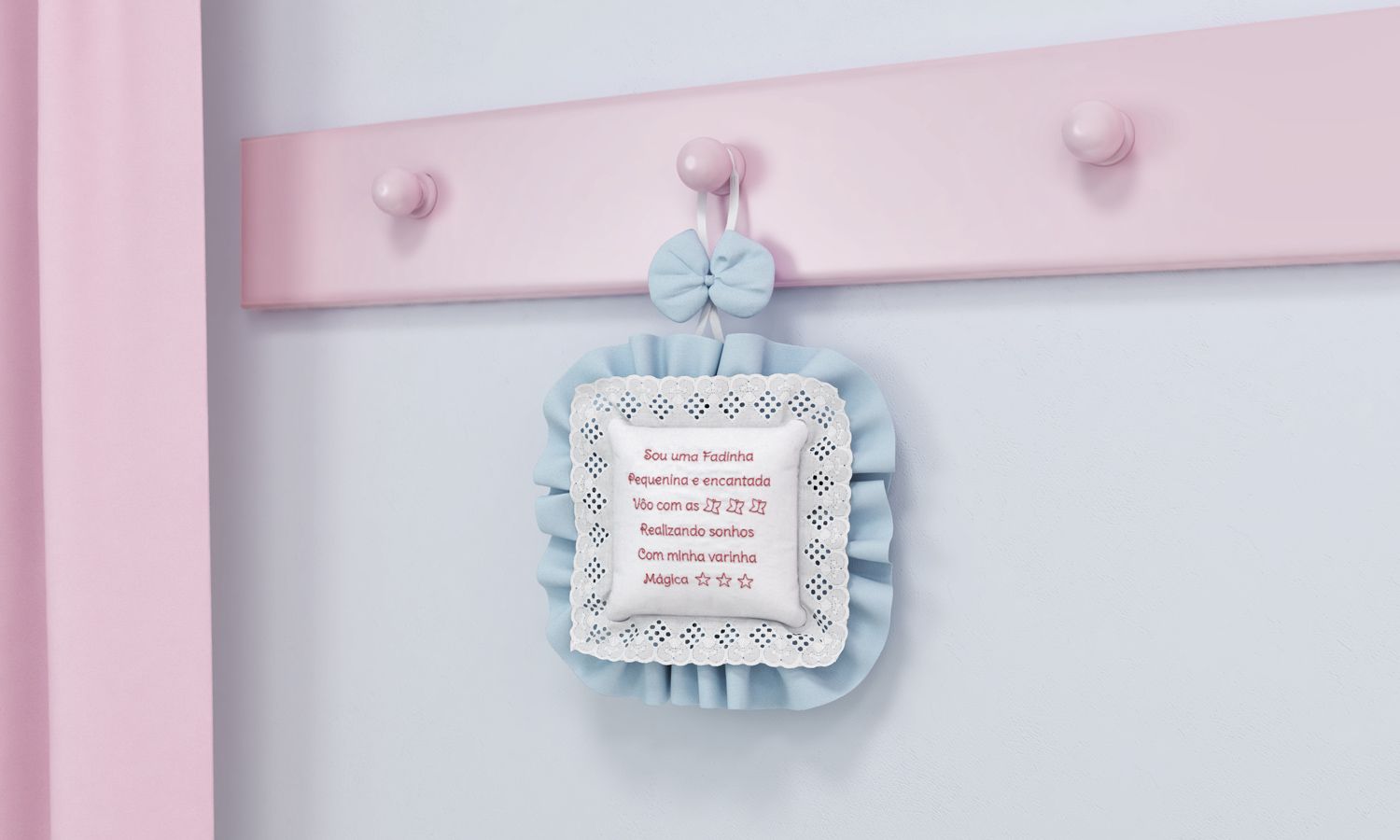Como num toque de mágica, o ninho da sua fadinha vai se transformar num universo encantado! O Medalhão de Porta da Coleção Fada traz a meiguice de um poeminha num bordado exclusivo que vai arrancar suspiros de toda a família! O acessório enfeita a porta da maternidade, completa a decoração do quarto de bebê e convida a família e os amigos para entrar no cantinho mais especial da casa. Esse modelo exclusivo apresenta um babadinho azul bebê que abraça um delicioso tecido acolchoado e harmoniza com diversos temas e estilos de ambiente. Aposte no seu bom gosto e presenteie uma mamãe com esse acessório encantador!