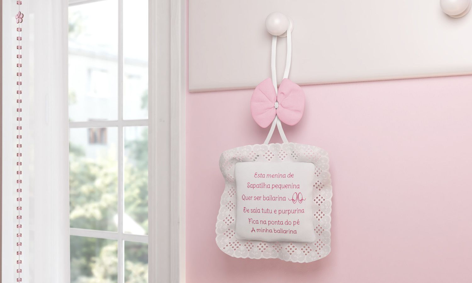 "Esta menina, de sapatilha pequenina, quer ser bailarina..." O Medalhão de Porta Pequena Bailarina traz um versinho doce e exclusivo da Grão de Gente para dar boas vindas a mais nova princesinha da família! Uma almofadinha branca com babados de bordado inglês e um singelo laço floral rosa formam um modelo delicado na medida certa para convidar os visitantes a entrarem no universo feminino e gracioso do Ballet.