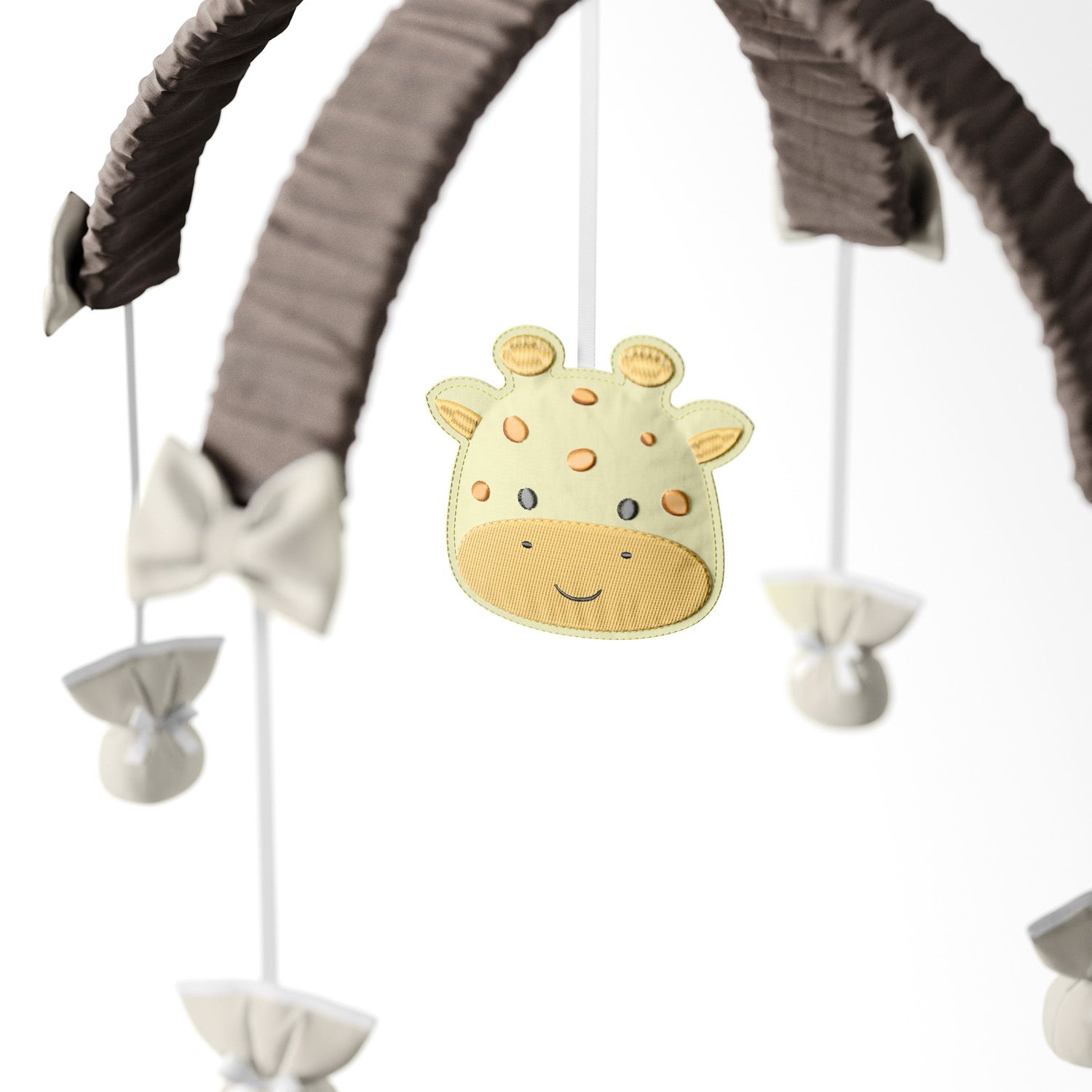 Confeccionado em tecido 100% algodão, o acessório traz a delicadeza de uma girafinha bordada que vai ajudar a relaxar e entreter o recém-nascido.