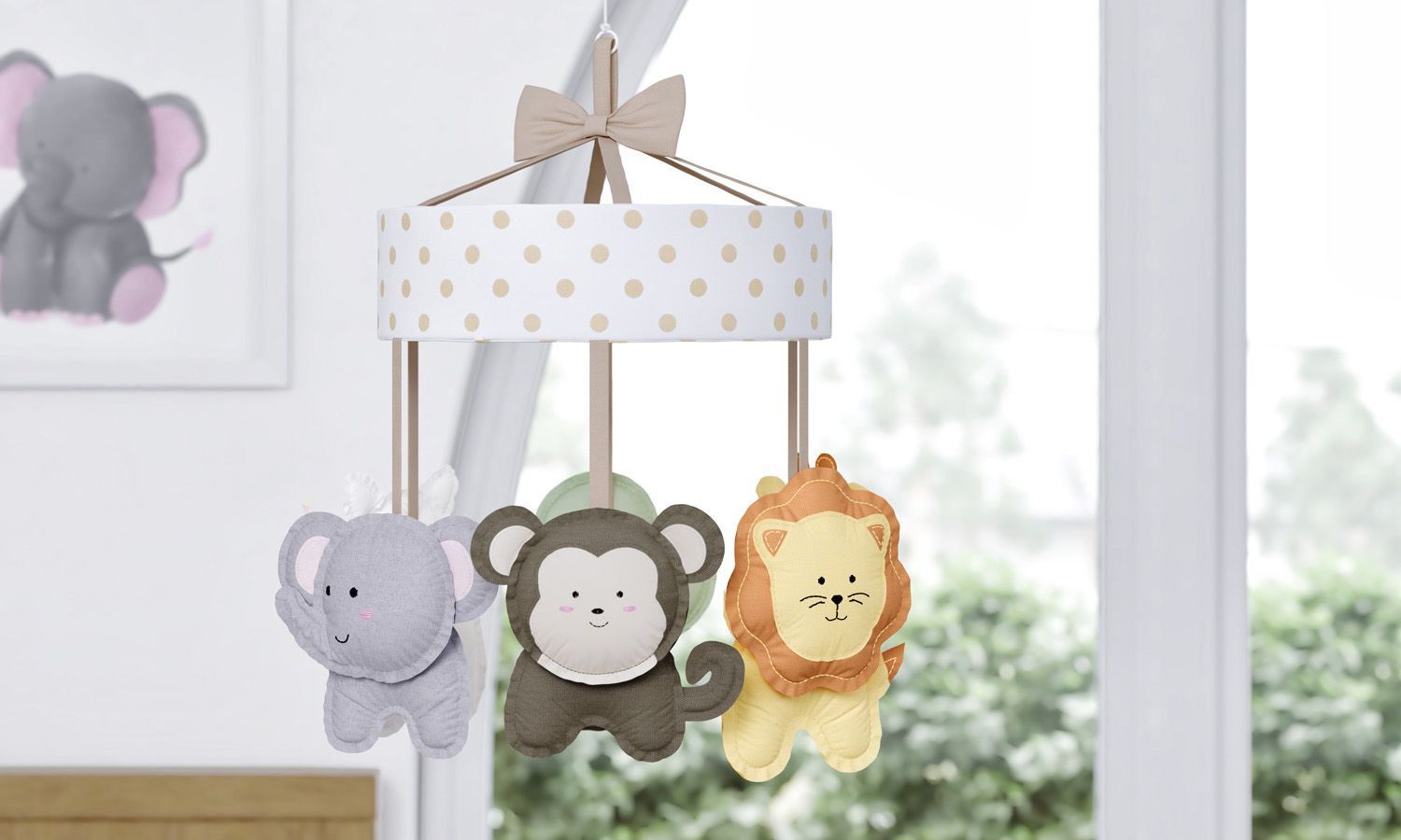Um móbile bastante gracioso, meigo e lúdico! Esse é o Móbile Amiguinhos Safári. Seu amor vai se sentir ainda mais calmo e protegido ao olhar para os super amiguinhos elefante, girafa, leão, macaquinho e zebra. O movimento das peças vai entreter o bebê dentro do bercinho, enquanto a paleta de cores tranquiliza graças a combinação suave. Ideal para embalar o sono do neném!