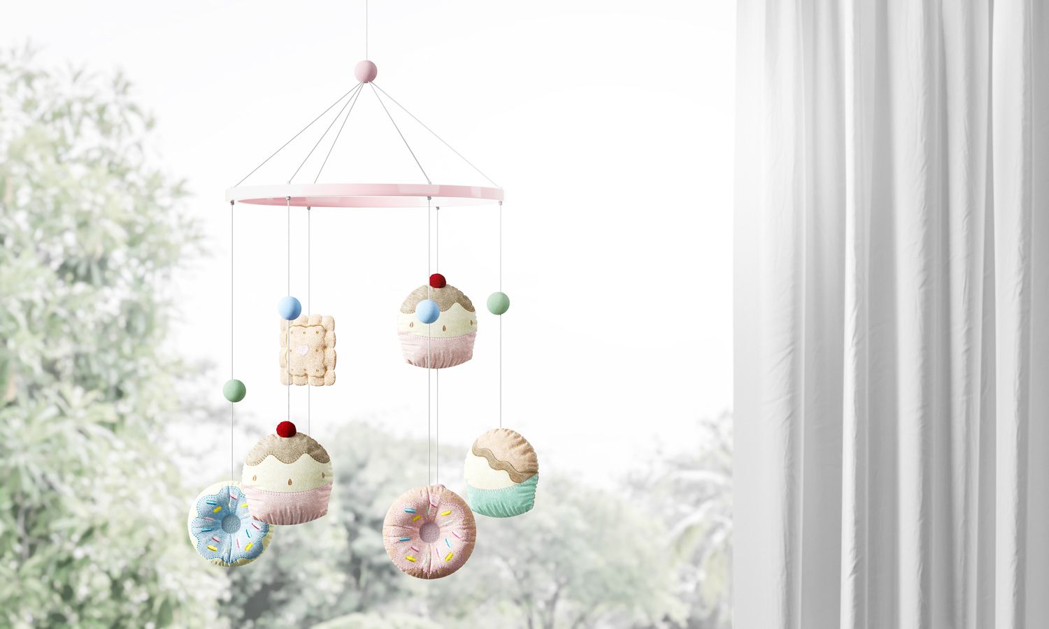 O Móbile Doce Encanto vai tornar o quarto da sua bebê ainda mais encantador e cheio de doçura! São lindos cupcakes (bolinhos), biscoitos, donuts e pompons, feitos de plush macio e bordados. Esse acessório ajuda a entreter sua princesinha com seu colorido suave e delicados movimentos. Você pode usar sobre o berço ou pendurar no teto do quarto para decorar o ambiente.