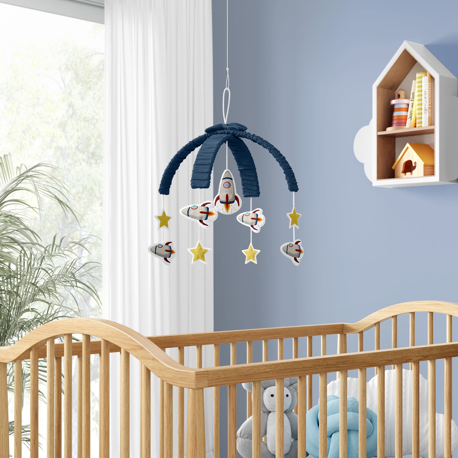 O Móbile Foguete Astronauta é um acessório lúdico e com um toque extra de fofura para compor a decoração do quarto de bebê!
