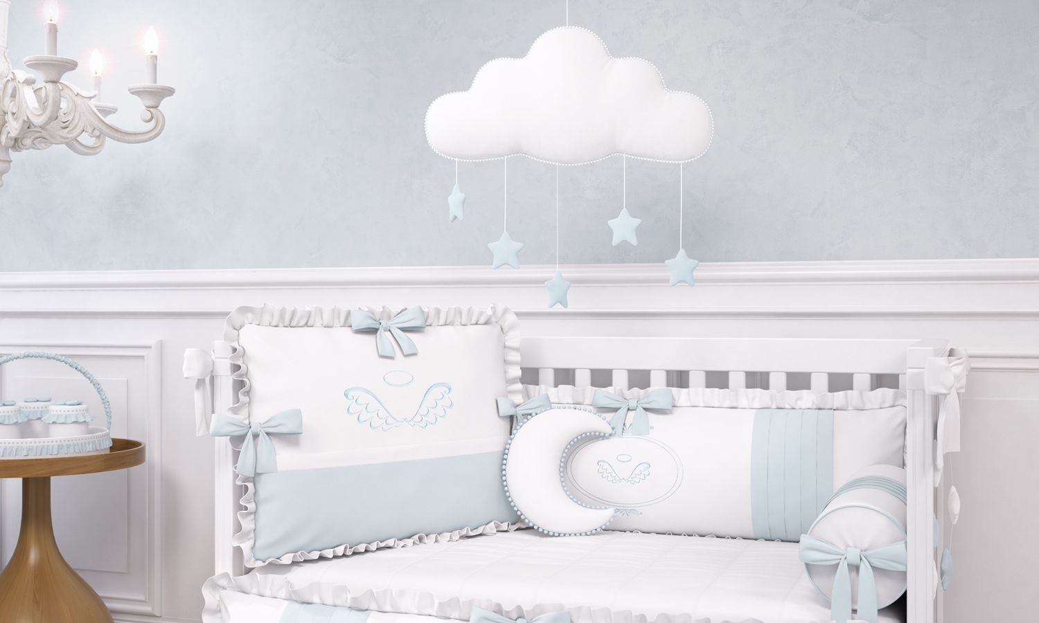 O Móbile da Coleção Anjo vai ser o primeiro contato do seu pequeno com um mundo lúdico e divertido! Esse item indispensável vai sofisticar a decoração do quarto de bebê e incentivar o desenvolvimento visual e motor do seu grande amor. As lindas estrelinhas presas numa nuvem com borda de singelos pompons enfeitam esse acessório exclusivo, que vai alegrar o cantinho do seu anjinho.