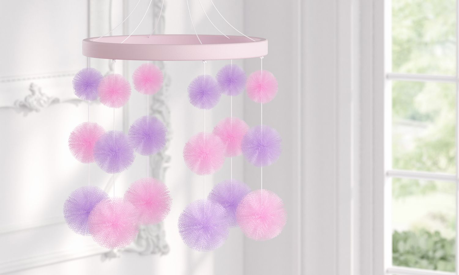 Estimular a imaginação e desenvolver a criatividade da sua bebezinha são alguns dos desejos das mamães e dos papais. Com o alegre e divertido Móbile Pompons Floral Monet, seu amor vai dar muitas risadas ao olhar para esse lindo enfeitinho, que tem pompons soft rosa e lilás com enchimento de 100% fibra poliéster siliconada. Sua princesa vai adorar e a decoração do quarto de bebê vai ficar ainda mais charmosa e delicada!