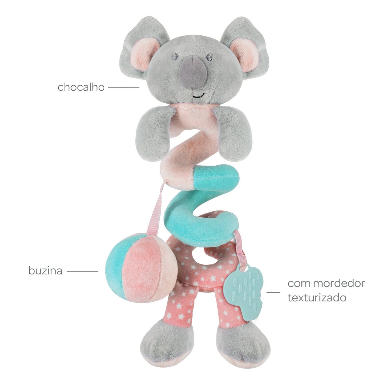 Leve e super fofa, a mola coala conta com som de chocalho, mordedor texturizado e buzina, tudo para deixar a brincadeira muito mais divertida para o seu bebê!