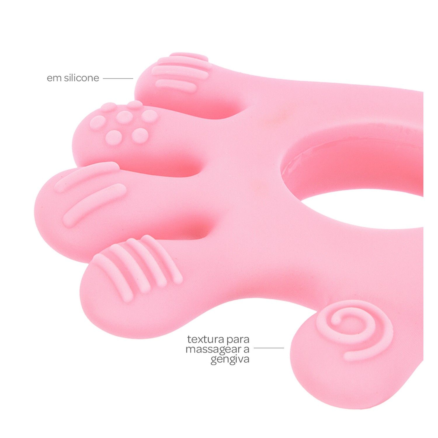 Com formato anatômico, o acessório é feito de silicone macio e texturizado, proporcionando um efeito calmante nas gengivas.