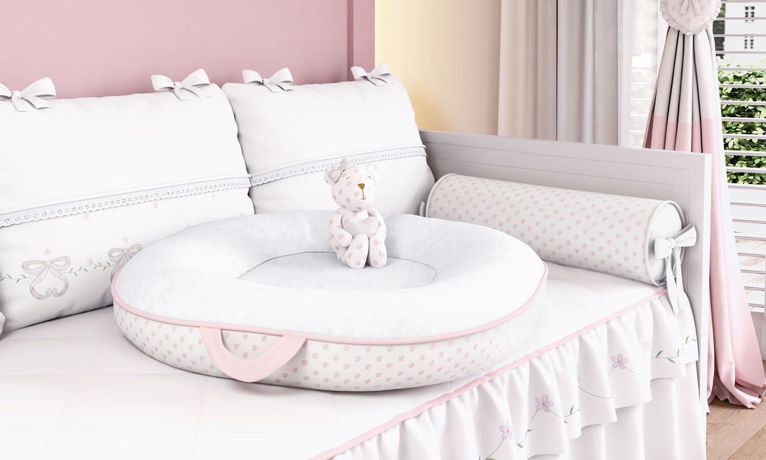 A Ninho Floral Sophia Rosa protege a cabecinha do bebê e serve de apoio para quando ela aprender a sentar e engatinhar. O item conta com alças para transporte e mix de tecidos: a parte superior é de malha e a estampadinha de tecido 80% Algodão / 20% Poliéster.