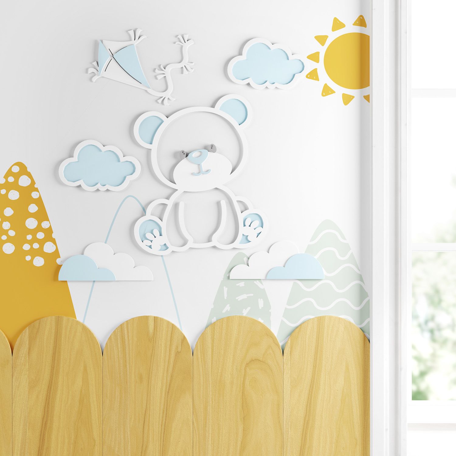 O Painel Decorativo Ursinho e Pipa Azul é um produto exclusivo da Grão de Gente. Uma escolha original e afetiva para completar a decoração do quarto de bebê. Com pintura acrílica semi-brilho, cada peça do conjunto é aerografada à mão e já vem montada para colar na parede como desejar.