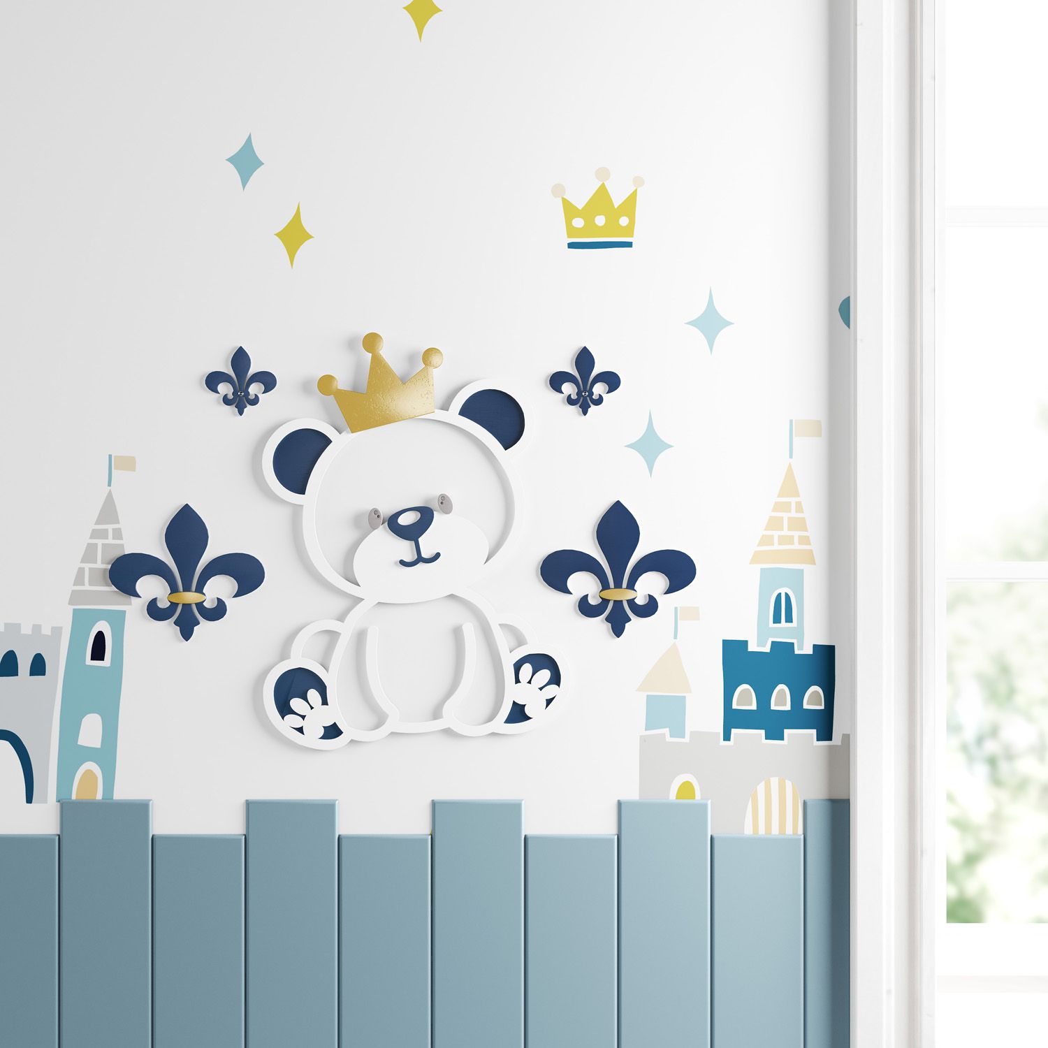 O Painel Decorativo Ursinho Príncipe é um produto exclusivo da Grão de Gente. Uma escolha original e afetiva para completar a decoração do quarto de bebê. Com pintura acrílica semi-brilho, cada peça do conjunto é aerografada à mão e já vem montada para colar na parede como desejar. Fácil de aplicar, o painel decorativo não precisa ser aparafusado na parede. Para fixação, recomendamos a utilização de cola quente ou fita dupla face.