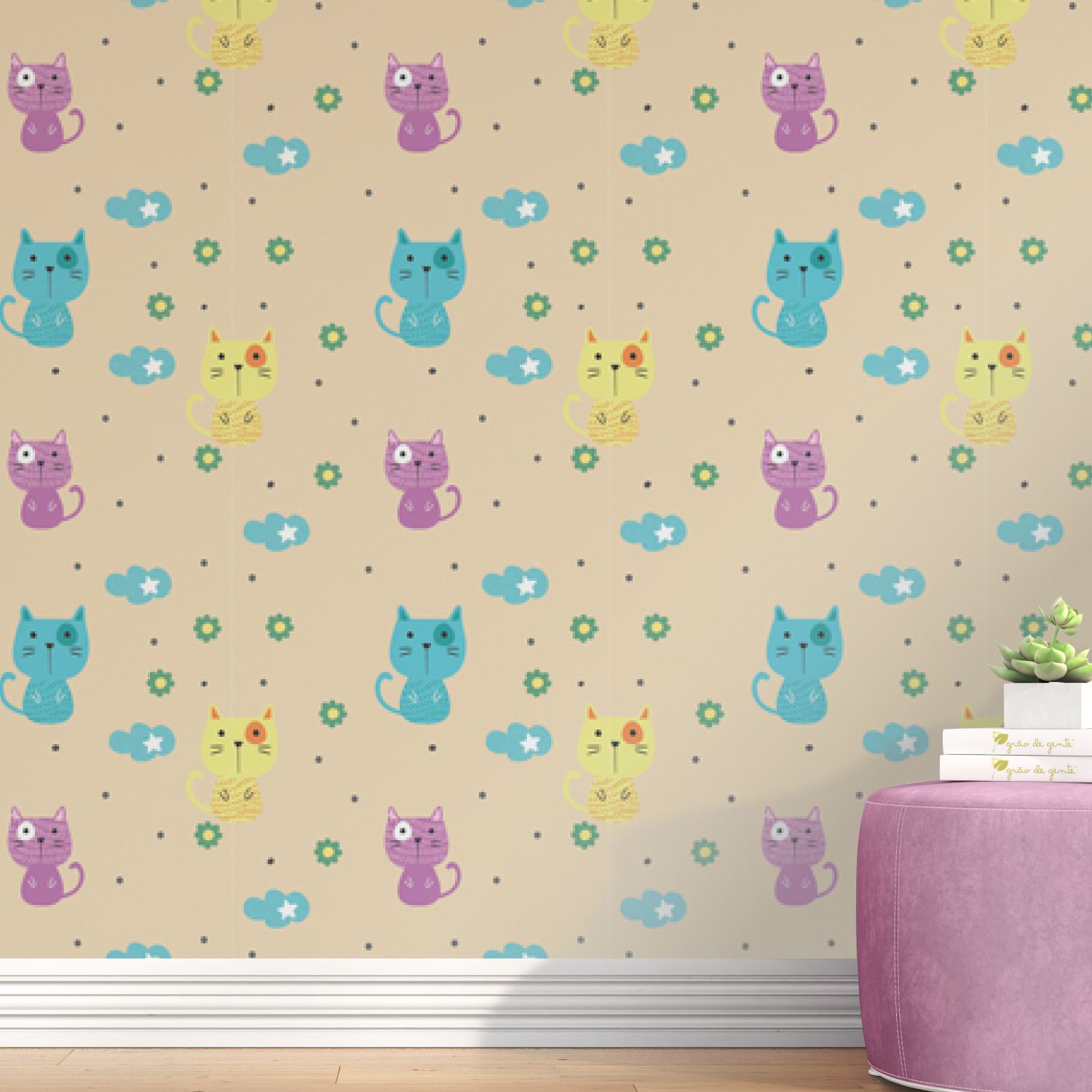 Decore o cantinho do seu amor com a praticidade e o toque divertido do Papel de Parede Gatos e Flores Azul, Roxo e Azul Turquesa, exclusivo da Grão de Gente.Por ser autoadesivo, não precisa de preparação de cola para aplicação. Para saber a quantidade de papel ideal no quartinho, basta dividir a largura da parede por 51cm.