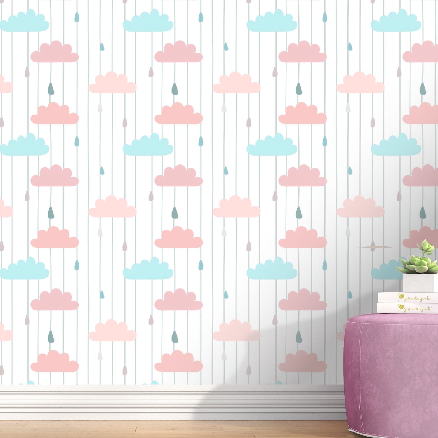 Papel de Parede Nuvem, Gotinha e Listra Turquesa e Rosa 3m