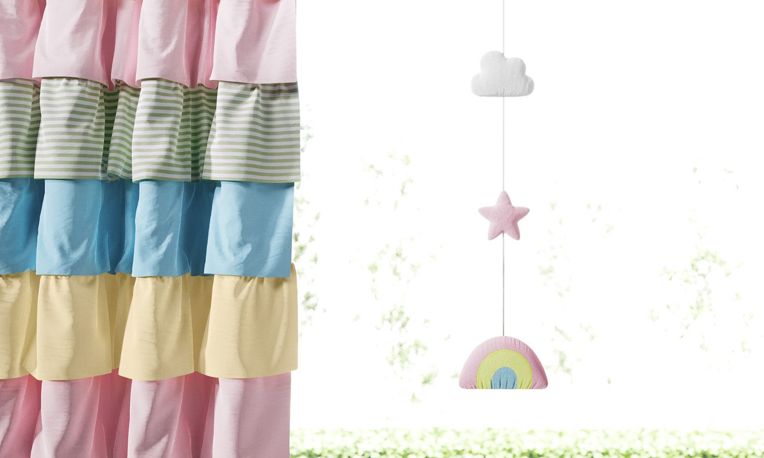 O arco-íris chegou para enfeitar a cortina da sua pequena com as nuvens e estrelas fofinhas do pêndulo da Coleção Arco-íris Patchwork, novidade da Linha Sabrina Sato Mom. Esse acessório multicolorido de plush adiciona um toque lúdico de amor e delicadeza ao quartinho da sua menina.