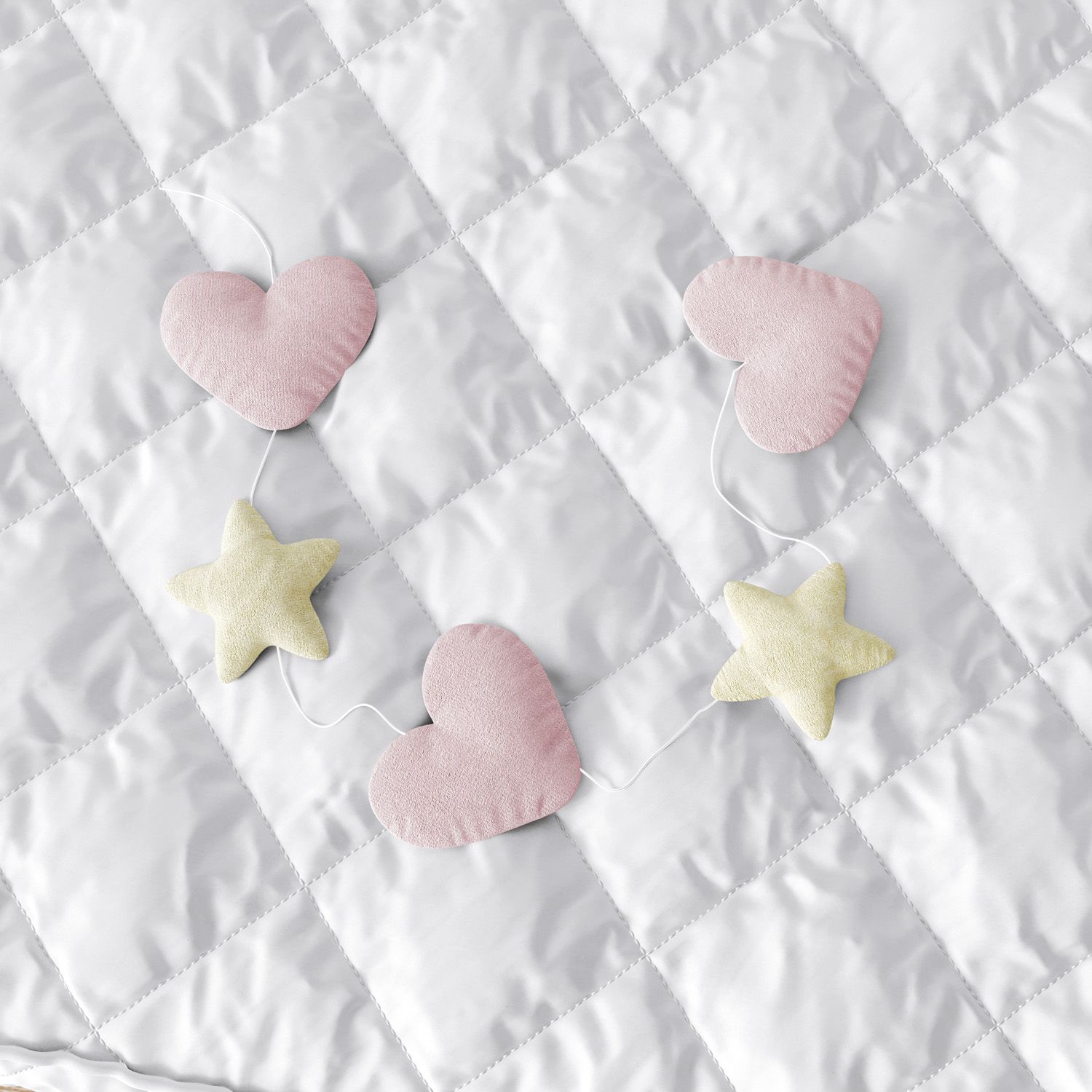 Uma proposta encantadora para completar a decoração do Quarto de Bebê ou Infantil! Feito à mão com tecido plush, o Pêndulo Cortina Estrelas e Corações traz delicadeza ao ambiente, com estilo lúdico e uma composição suave em tons pastéis.