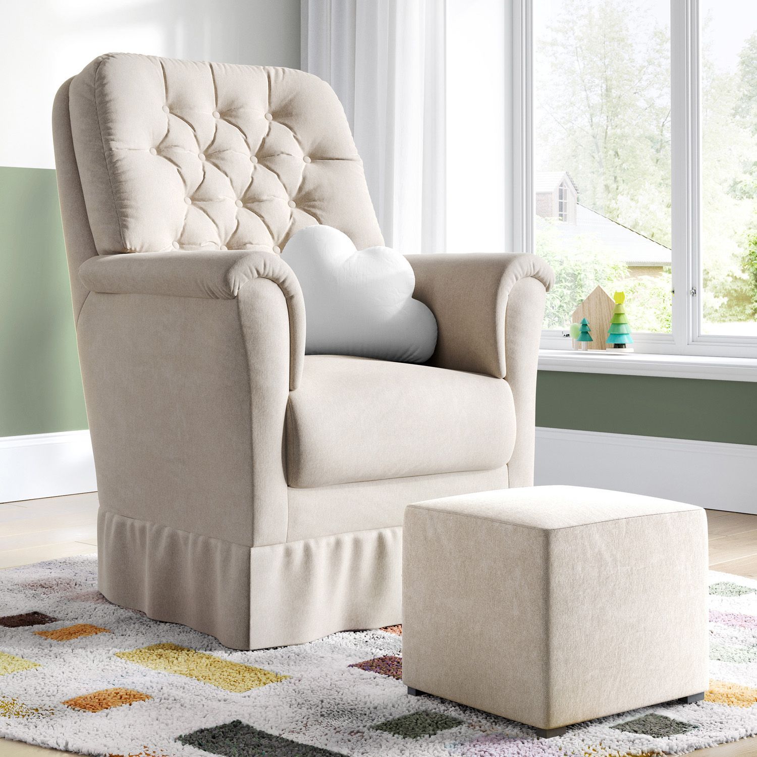 A Poltrona Angélica Giratória Bege + Puff vai encantar as mamães que buscam conforto e sofisticação para o quarto de bebê. Seu design ergonômico e muito charmoso, com orelhas laterais e base giratória, destaca a inspiração elegante da peça e favorece o descanso de mãe e bebê.
