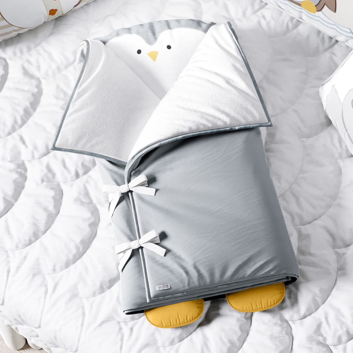 O Porta Bebê Pinguim Cinza e Amarelo oferece aconchego e proteção para o descanso do bebê. Um acessório macio, confeccionado com tecido 100% algodão, forro plush e bordado exclusivo da Grão de Gente para colorir o enxoval do seu amor. Essa peça versátil facilita a rotina dos pais e respeita o sono do bebê, pois, com ela, você não precisa descobrir o pequeno na hora de tirar do berço ou do carrinho.