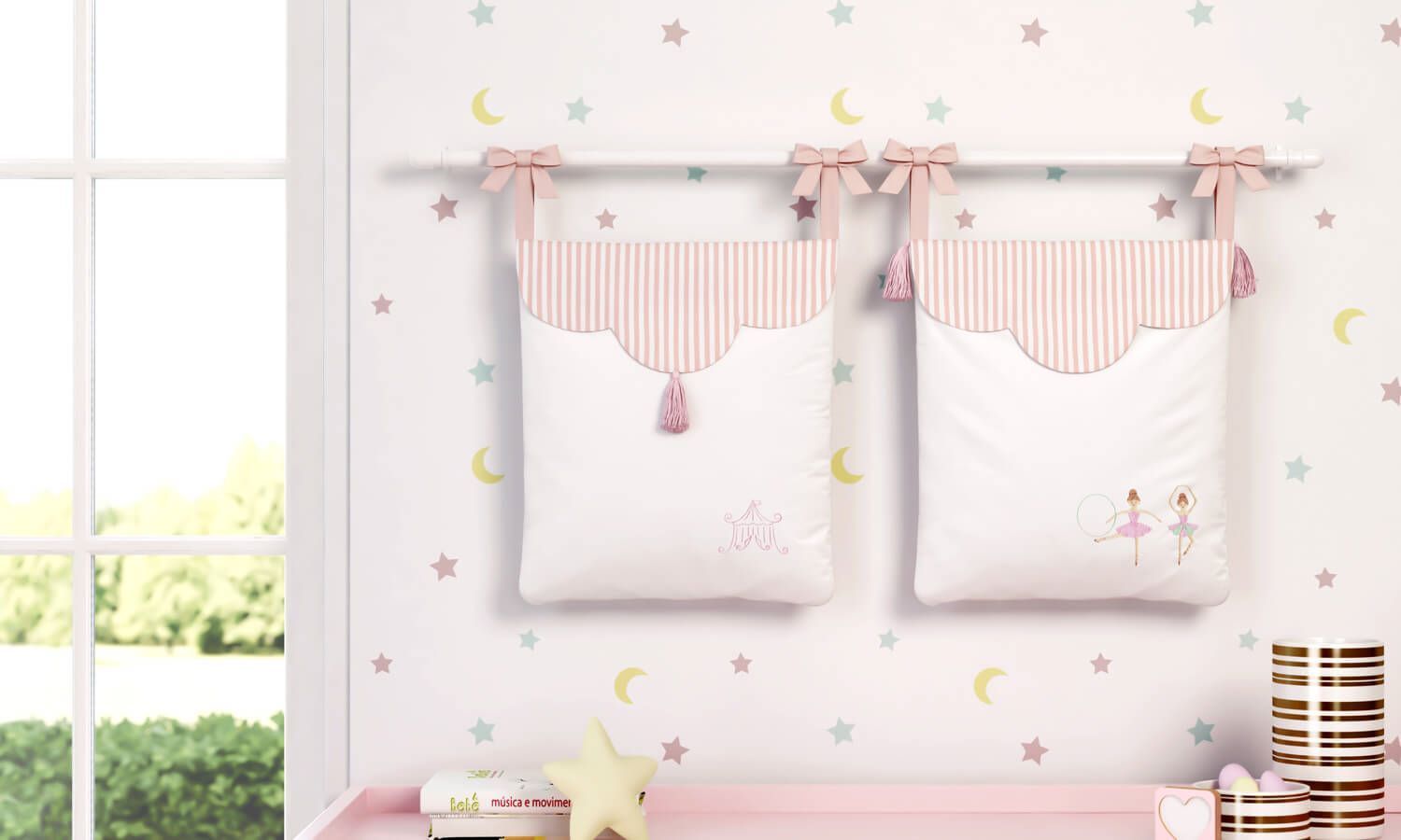 Lacinhos, tassel e listrinhas com tons em branco e rosé! O Porta Fraldas Bailarina Trapezista da Linha Sabrina Sato Mom se destaca não somente pela variedade de detalhes incríveis, mas principalmente por toda a sua funcionalidade. Com esse acessório as fraldinhas ficam sempre à mão e a rotina de cuidados com a higiene da bebê se torna mais prática. O bordado de circo, bailarina e trapezista traz o visual lúdico ao quarto de bebê.