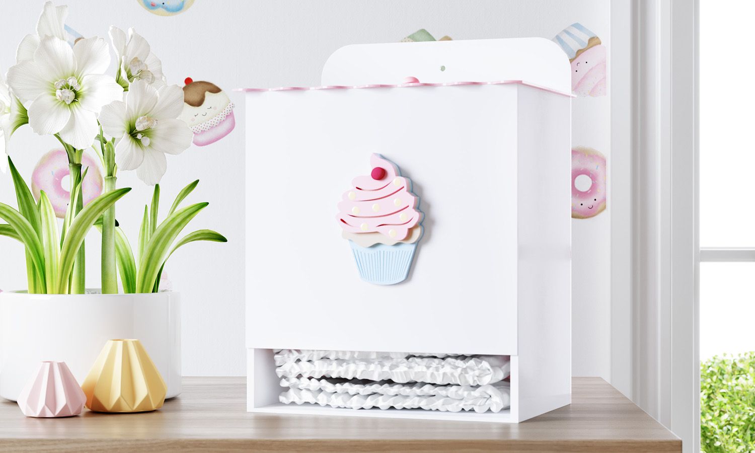O Porta Fraldas Cupcake Doce Encanto combina praticidade e um toque lúdico na decoração do quarto de bebê. Com uma linda aplicação de cupcake em MDF, o acessório acompanha uma tampa rosa e mantém as fraldas do bebê organizadas no cantinho da troca.