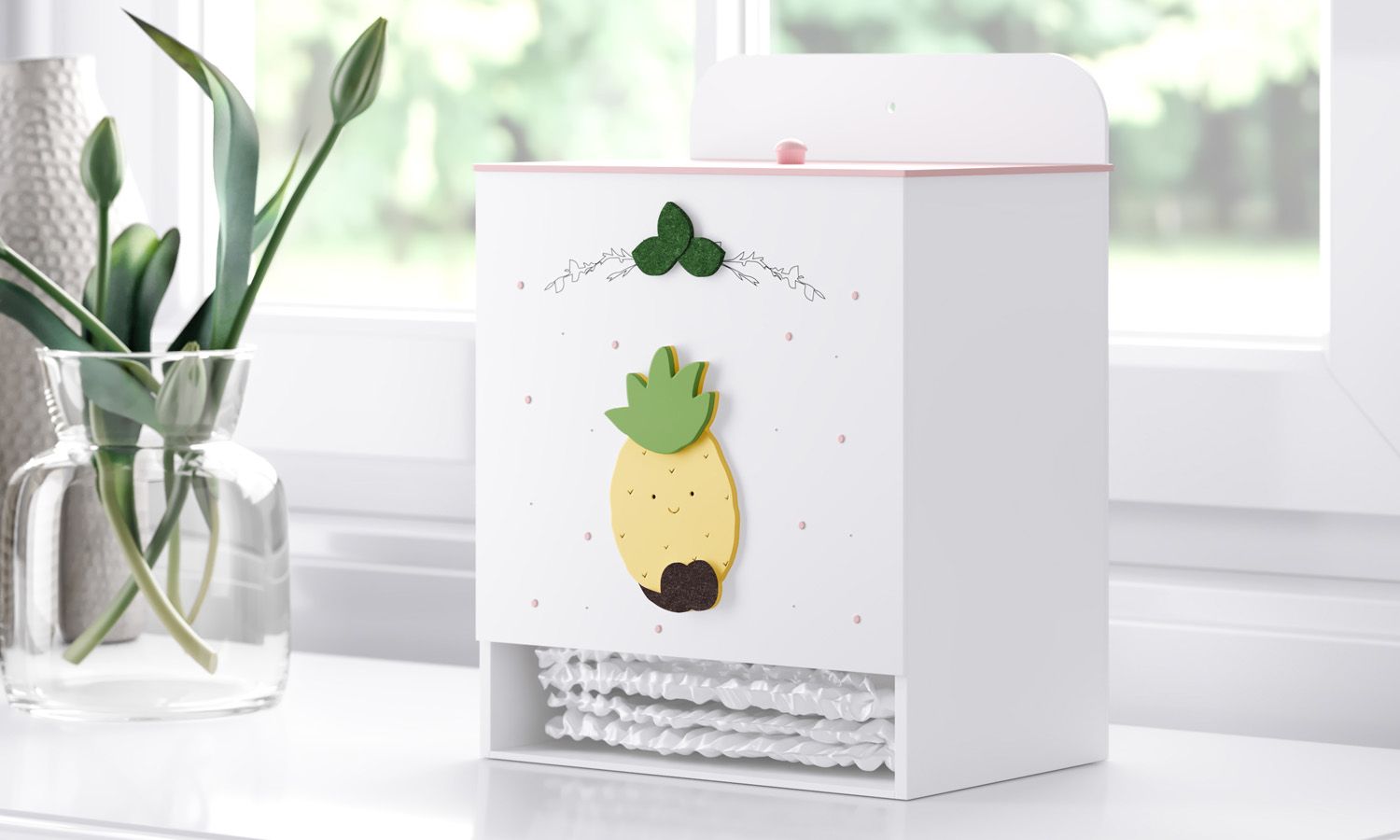 Prático e delicado, o Porta Fraldas MDF Abacaxi Frutinhas é indispensável para compor o kit higiene e embelezar o quarto de bebê. Confeccionado em madeira 100% MDF, esse item deixa as fraldinhas organizadas e sempre à mão, facilitando a rotina de cuidados com o recém-nascido. Seu design encanta com pequenas bolinhas cor-de-rosa pintadas à mão e detalhes gravados à laser, folhas em feltro e aplique de abacaxi!