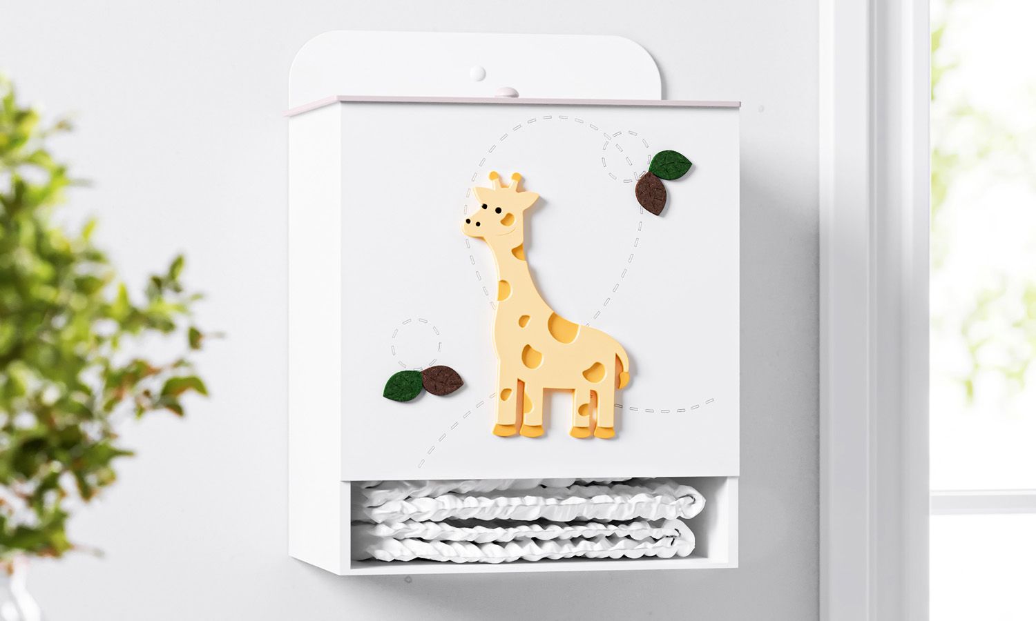 Prático e lúdico, o Porta Fraldas MDF Girafinha Safári Baby é indispensável para compor o kit higiene e embelezar o quarto de bebê. Confeccionado em madeira 100% MDF, esse acessório mantém as fraldinhas organizadas e sempre à mão, facilitando a rotina de cuidados com o recém-nascido. Seu design encanta com aplique de girafa e folhas de feltro.