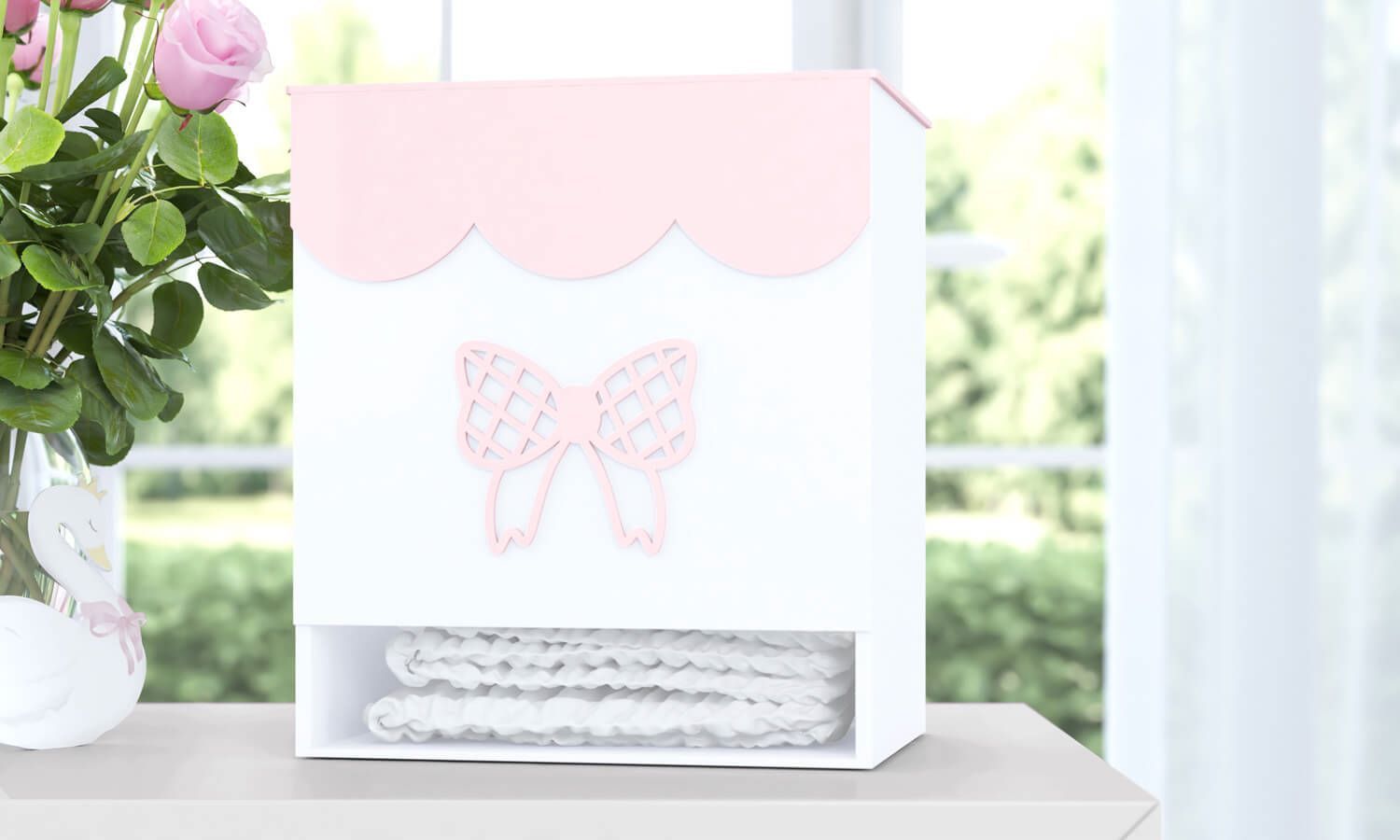 As mamães e os papais precisam da praticidade do Porta Fraldas MDF Lacinho nos cuidados do dia dia com a princesinha. Com esse acessório as fraldinhas ficam sempre à mão e o cantinho da troca de fraldas se torna ainda mais funcional.