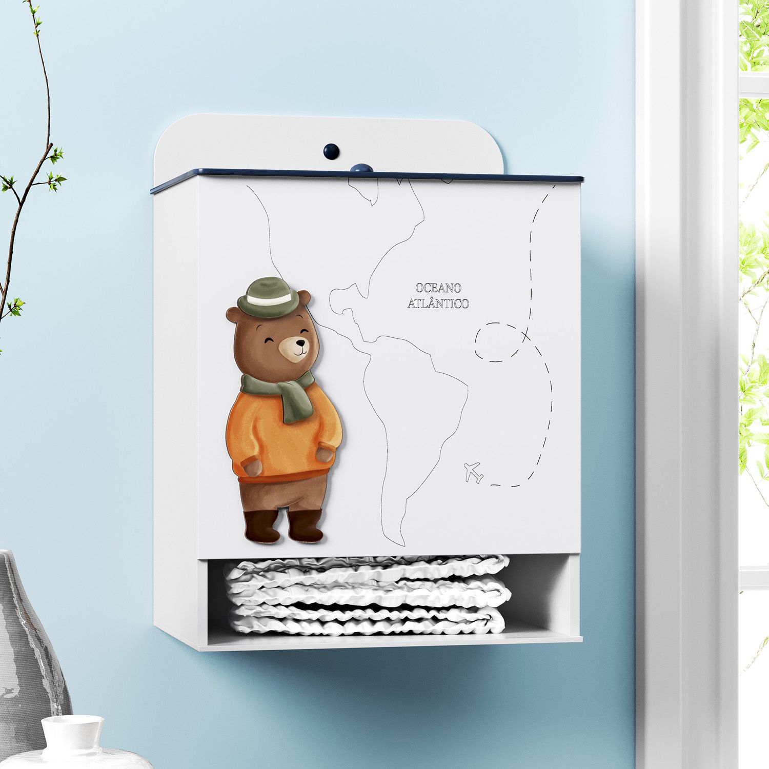 Prático e lúdico, o Porta Fraldas MDF Teddy Pelo Mundo é indispensável para compor o kit higiene e completar a decoração do quarto de bebê. Confeccionado em madeira 100% MDF, esse acessório mantém as fraldinhas organizadas e sempre à mão, facilitando a rotina de cuidados com o recém-nascido. Seu design encanta com aplique de ursinho e gravação à laser do mapa mundi!