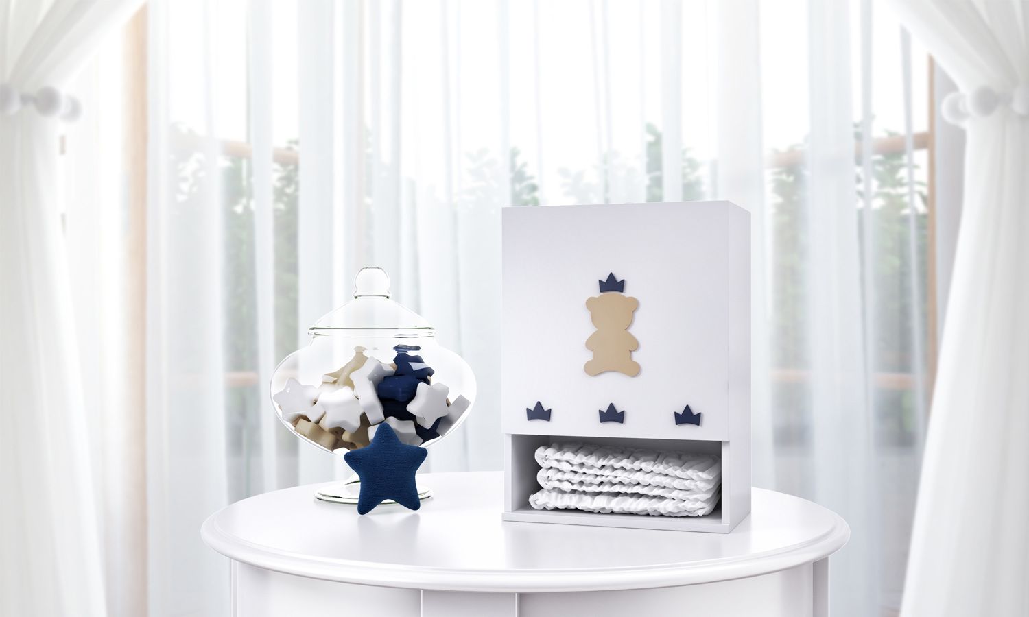 Manter o cantinho organizado, auxiliar no dia a dia e, de quebra, embelezar a decoração do quarto de bebê é função do Porta Fraldas Urso Teddy Realeza! Feita de madeira 100% MDF, a peça otimiza o tempo da família e deixam as fraldinhas do recém-nascido sempre à mão, facilitando a hora da troca. Toda a nobreza dessa coleção transparece no urso amadeirado com coroas e a sofisticada paleta de cores, com palha, branco e o requintado azul-marinho.